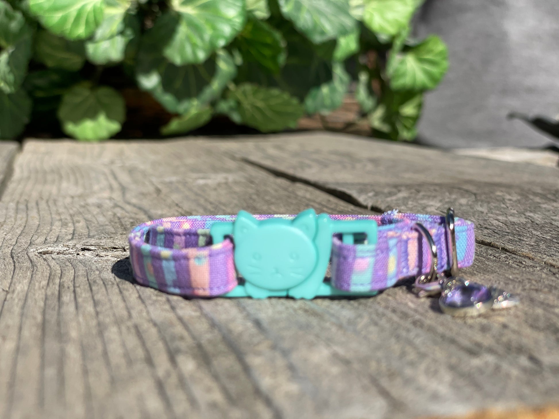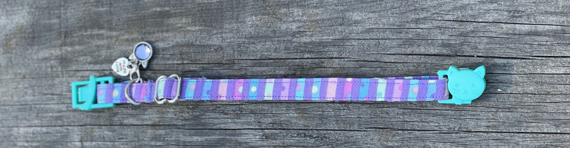 This collar is a hoppin’ good time! Its stripes of purple, mint, peach, blue, pink, and lavender, along with its sporadic polka-dots, are perfect for any fun celebration! It’s sure to put a spring in your step! Each collar comes with a coordinating charm*. This hand-crafted collar is made with 100% cotton fabric and a breakaway clasp. This elegant collar is sure to last for years.