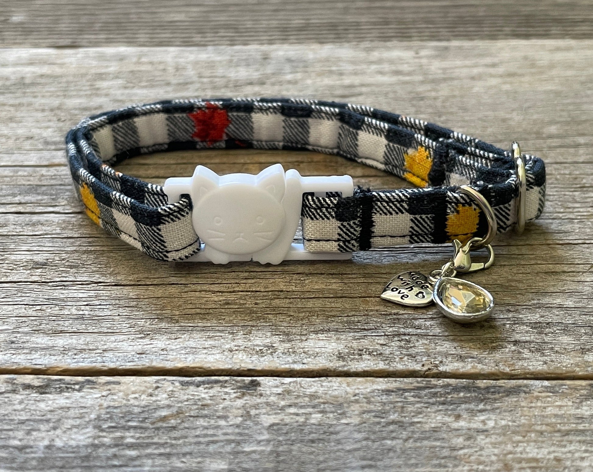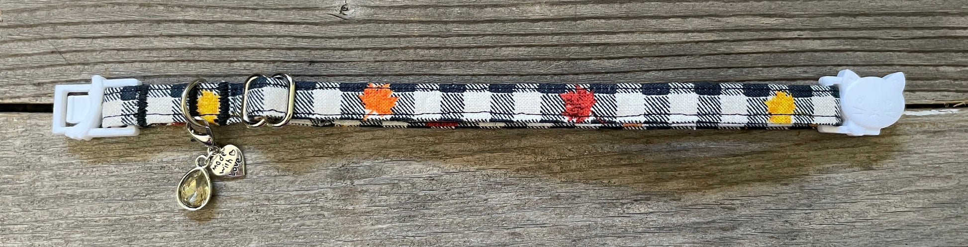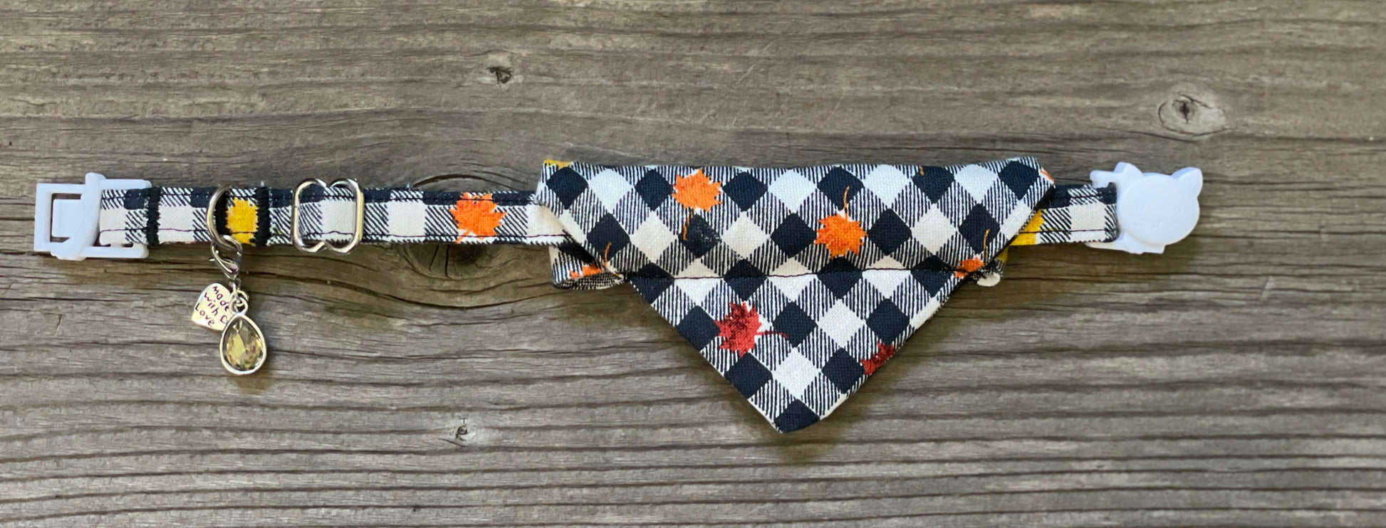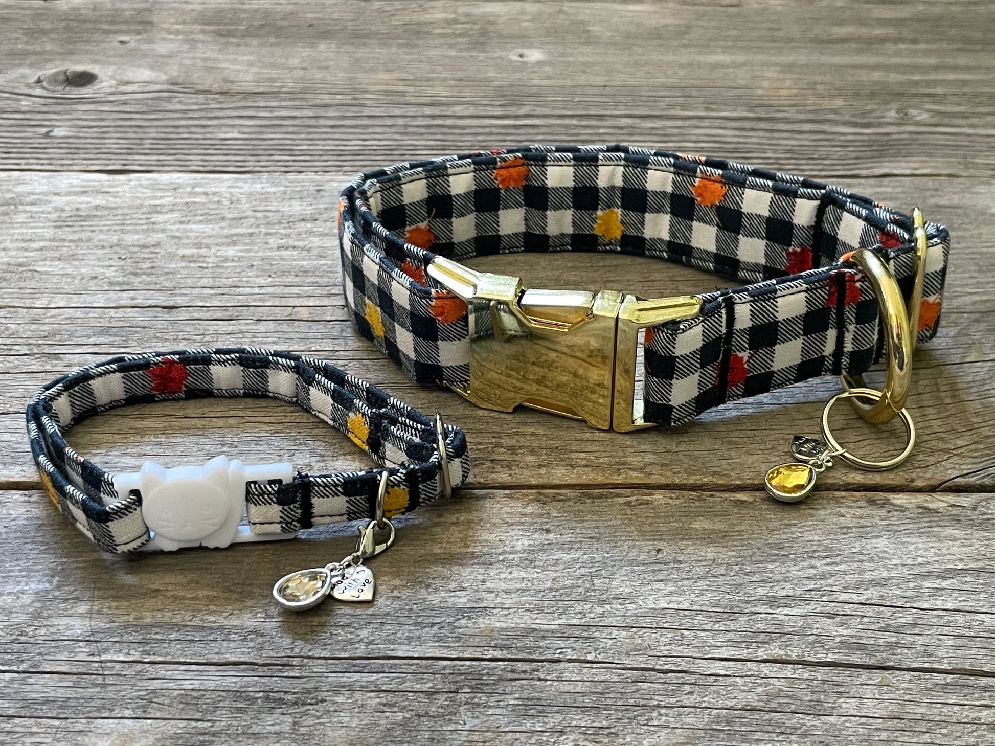Crunchy leaves, a brisk cool breeze, just throw in a cute outfit and you have the perfect fall day. This charcoal and white gingham pattern is spattered with orange, yellow, and rust-colored maple leaves. This pattern is perfect for any pet that loves jumping into a pile of leaves or catching them as they fall.