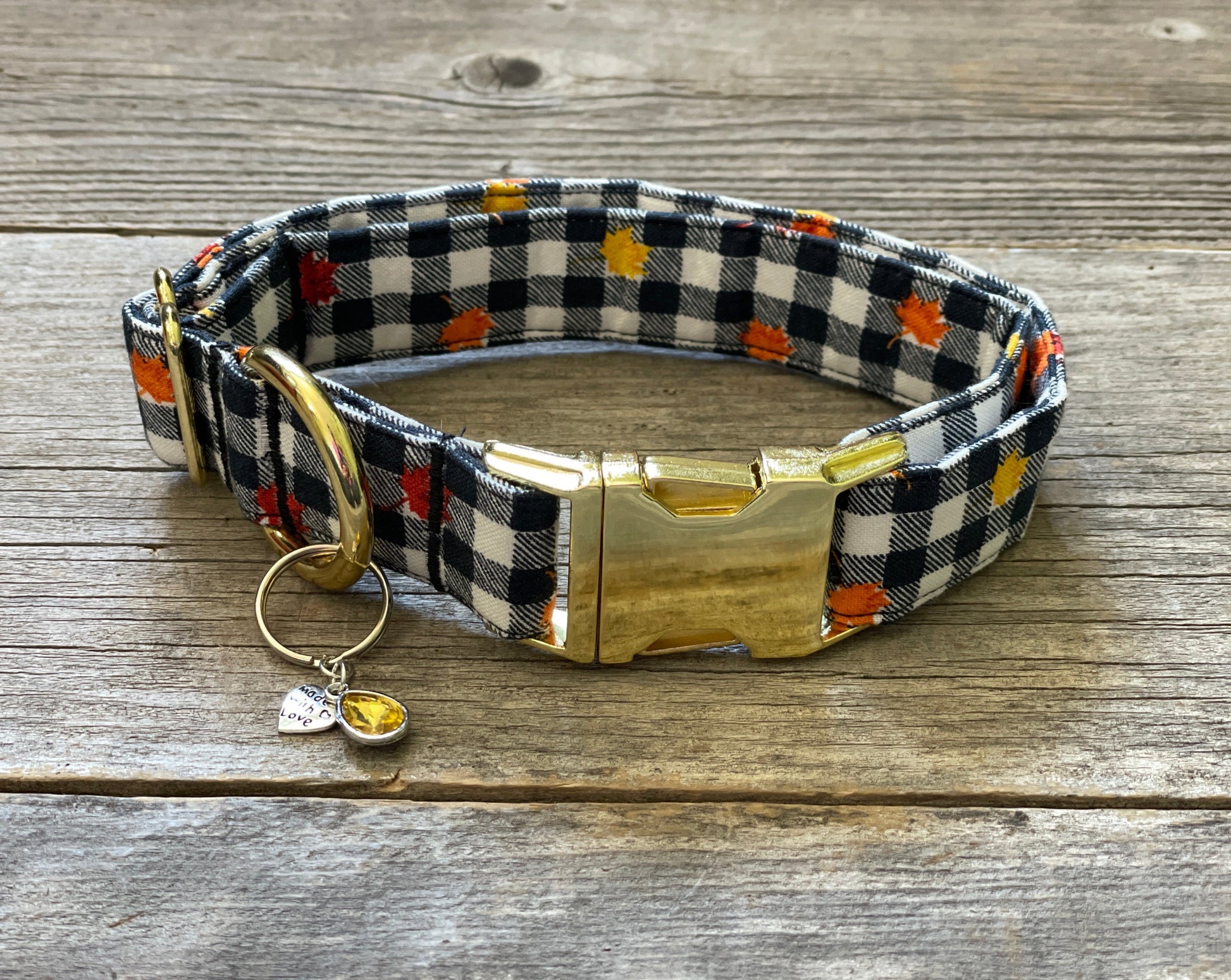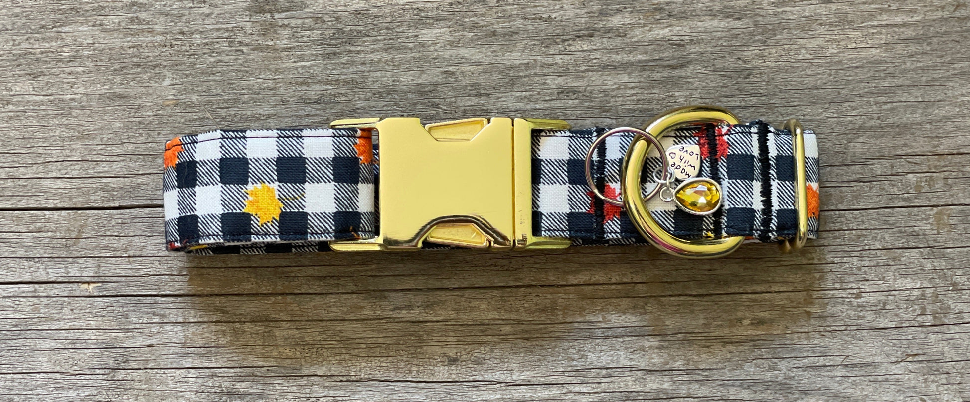 Crunchy leaves, a brisk cool breeze, just throw in a cute outfit and you have the perfect fall day. This charcoal and white gingham pattern is spattered with orange, yellow, and rust-colored maple leaves. This pattern is perfect for any pet that loves jumping into a pile of leaves or catching them as they fall.