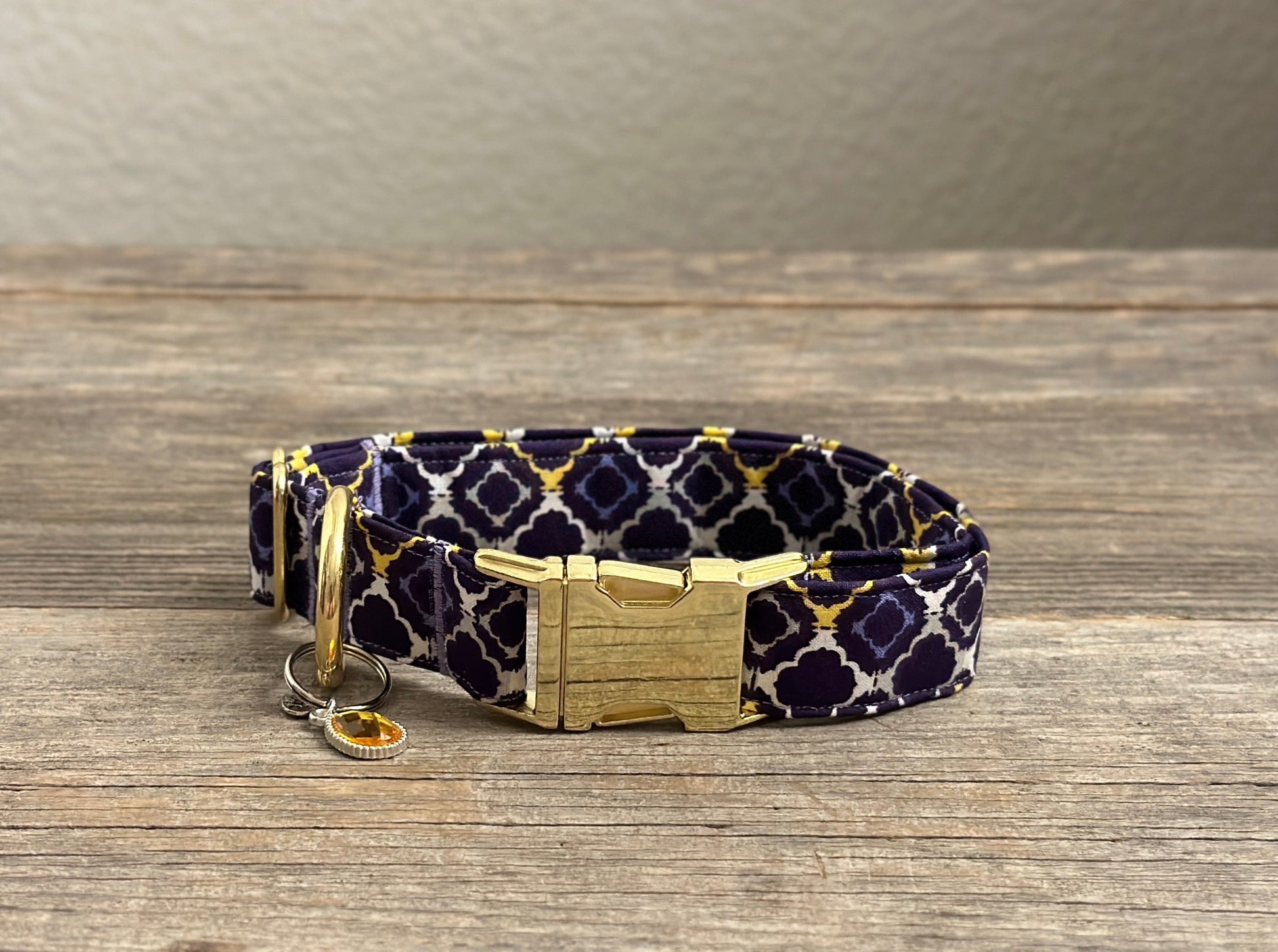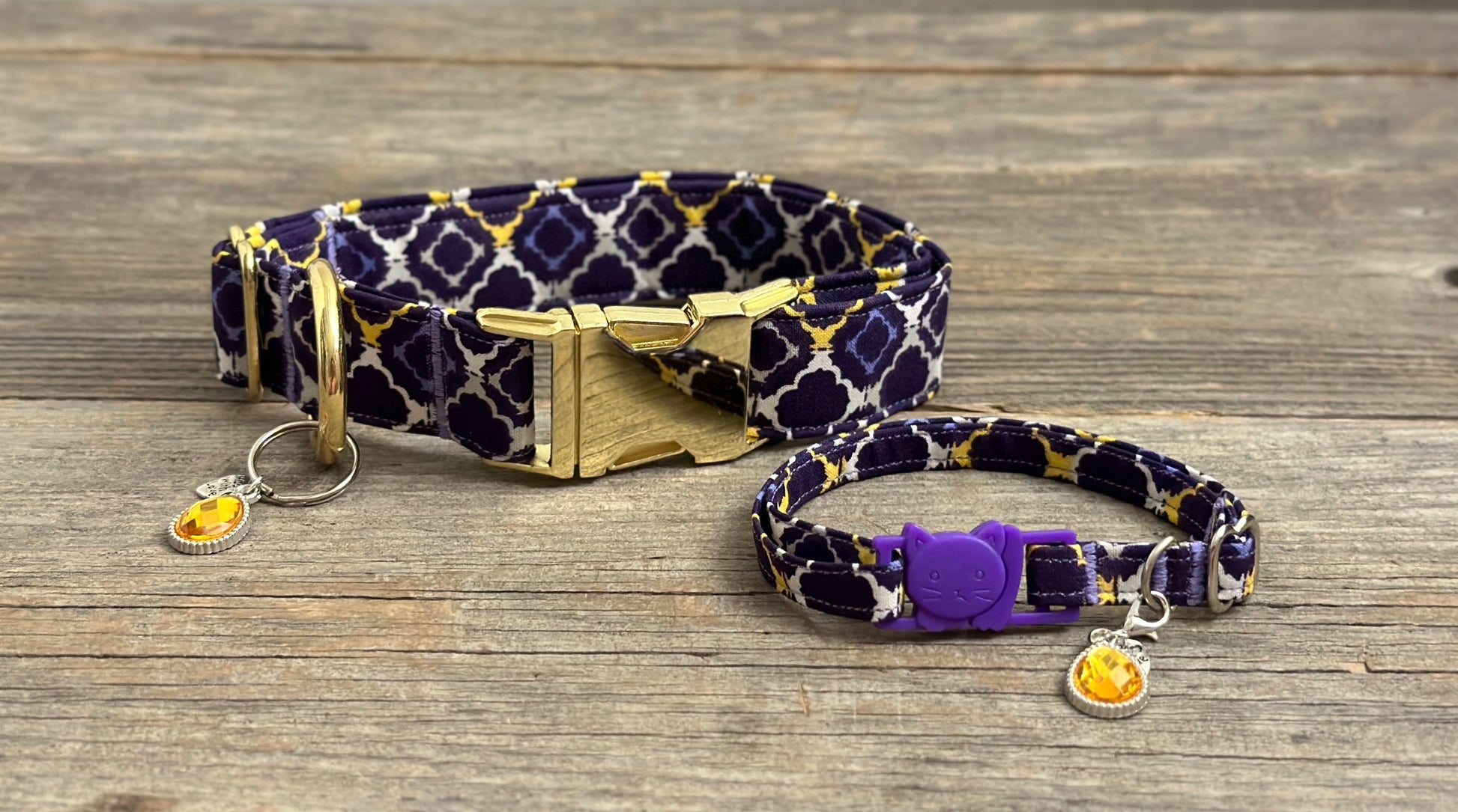 This collar has a matching leash option, don't forget to check it out! Our leashes are 5-foot long, 1-inch wide, and come with a heavy-duty silvertone metal spring-loaded hook that attaches to the D-ring on your pet's collar**. Each collar comes with a coordinating charm*. This hand-crafted collar is made with 100% cotton fabric and your choice of a metal or plastic buckle with a matching adjuster. Each collar is made with a reinforced metal D-ring. This elegant collar is sure to last for years.