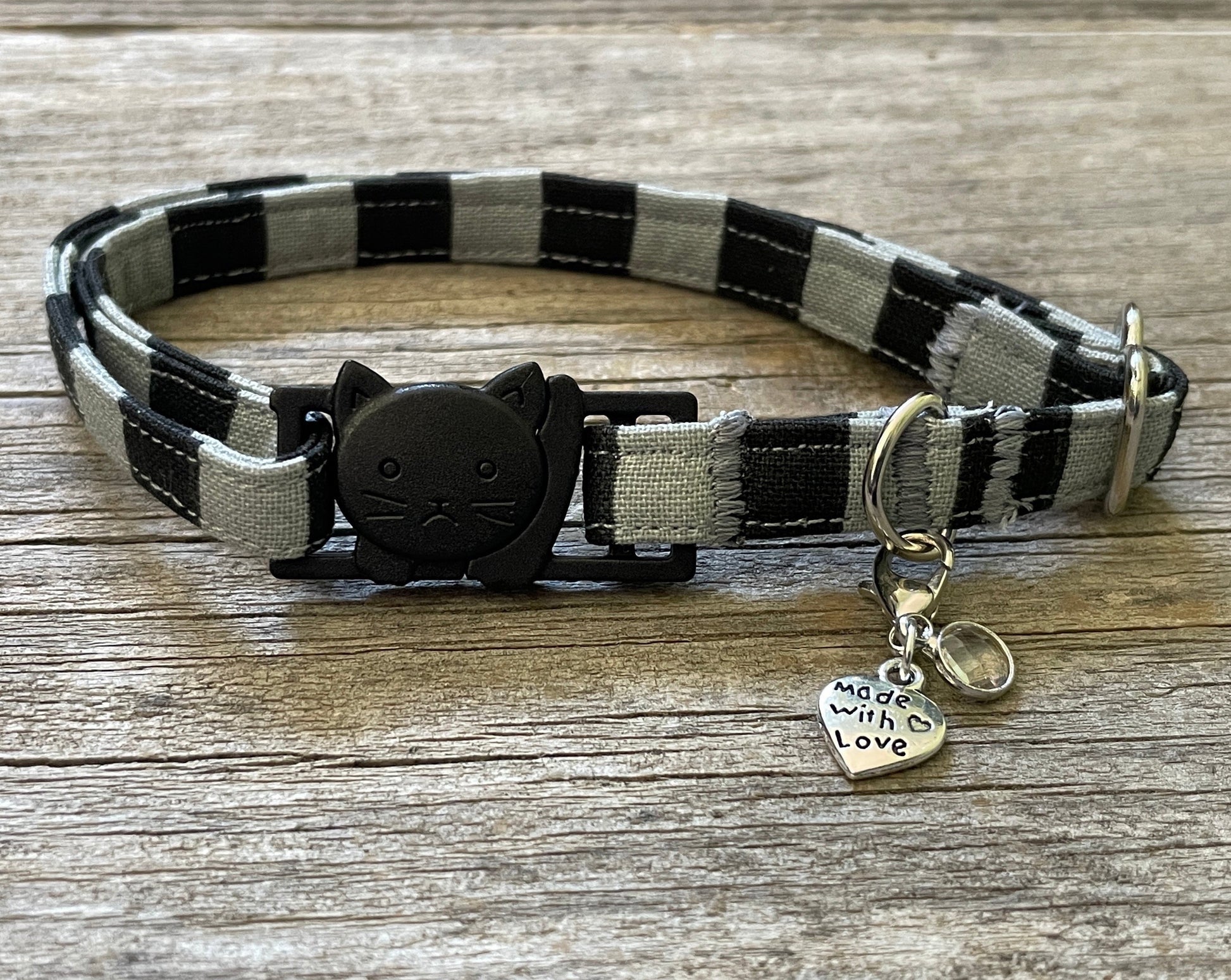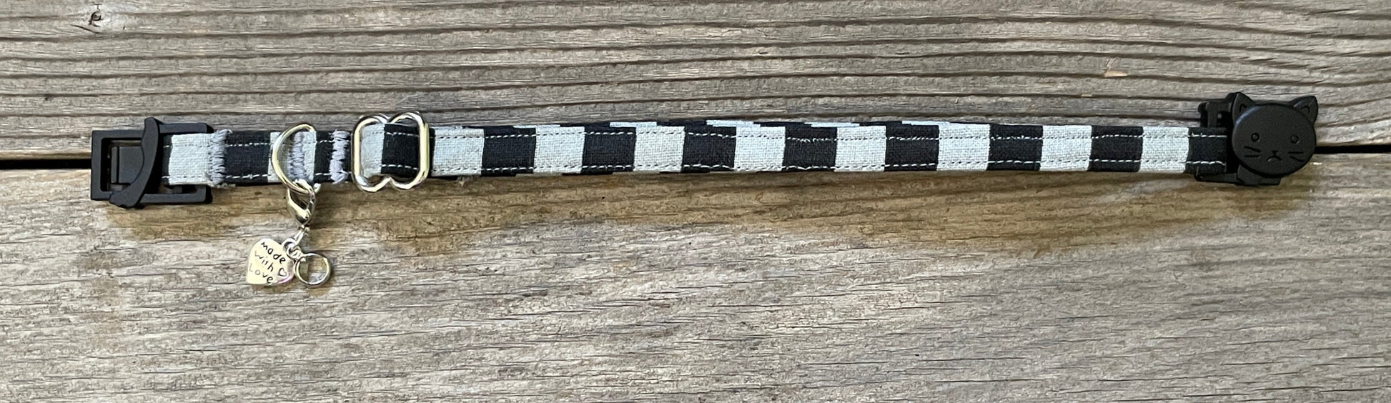 Our cat collars are 3/8" wide and have a plastic breakaway buckle.