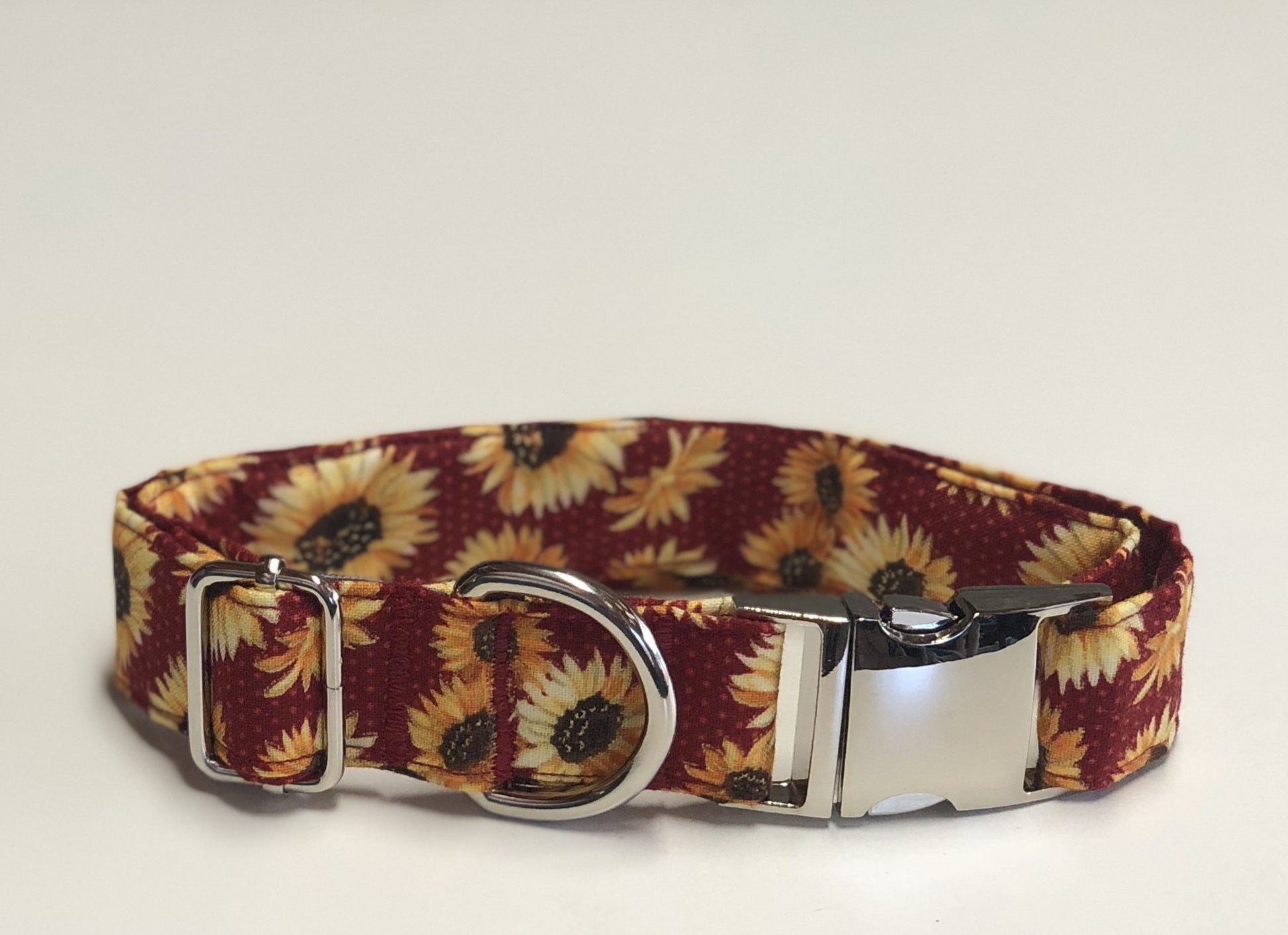 Flecks of gold peak throughout the centers of these happy sunflowers on a deep burgundy background with the tiniest polka dots. This collar makes you feel like you’re sitting on the porch enjoying a beautiful harvest sunset. Each collar comes with a coordinating charm*. This hand-crafted collar is made with 100% cotton fabric and your choice of a metal or plastic buckle with a matching adjuster. Each collar is made with a reinforced metal D-ring. This elegant collar is sure to last for years.