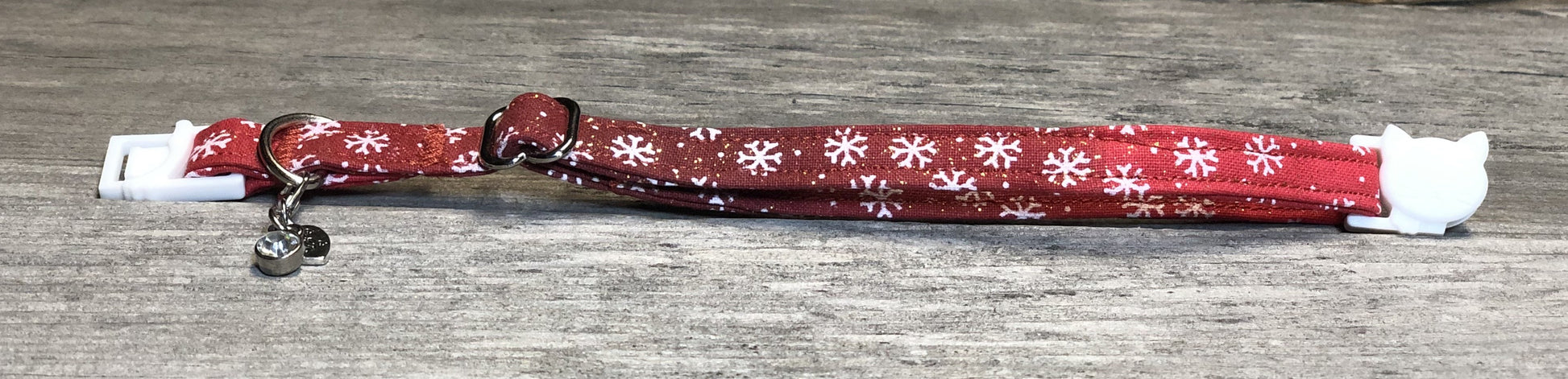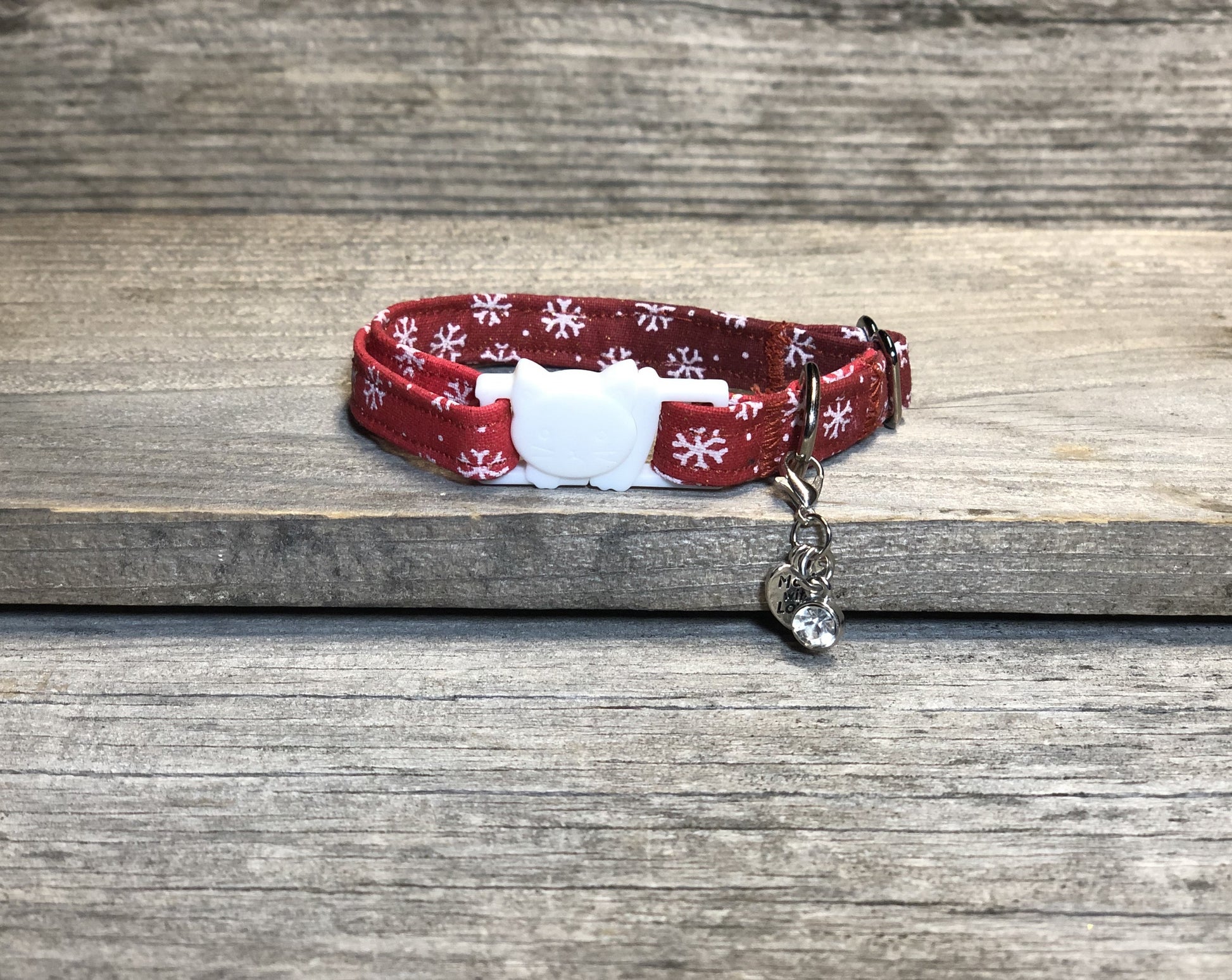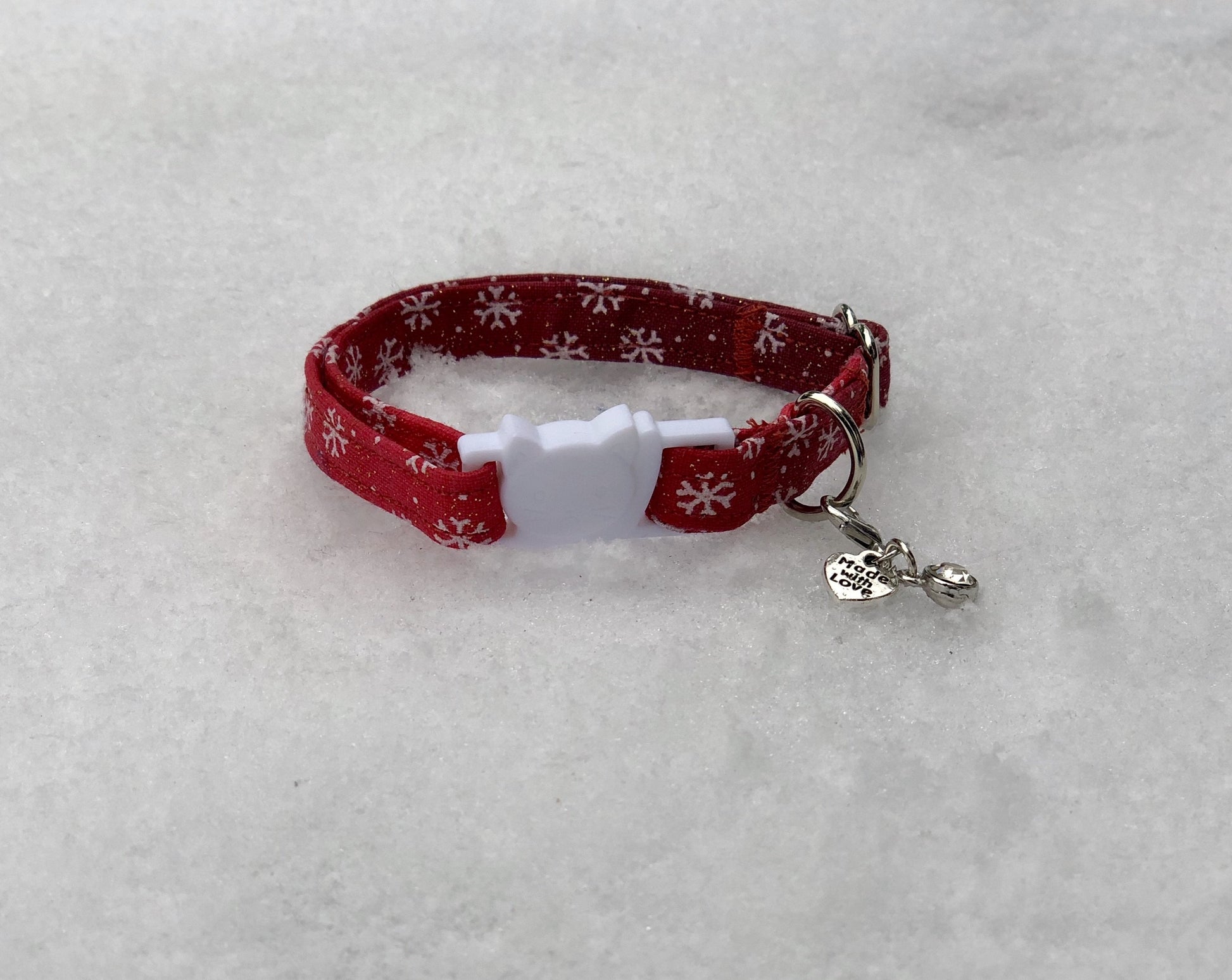 This collar gives a little extra razzle-dazzle to both holidays and winter. It has a bright, cheerful ombre red background and glittering gold on white snowflakes. Each collar comes with a coordinating charm*. This hand-crafted collar is made with 100% cotton fabric and a breakaway clasp. This elegant collar is sure to last for years.