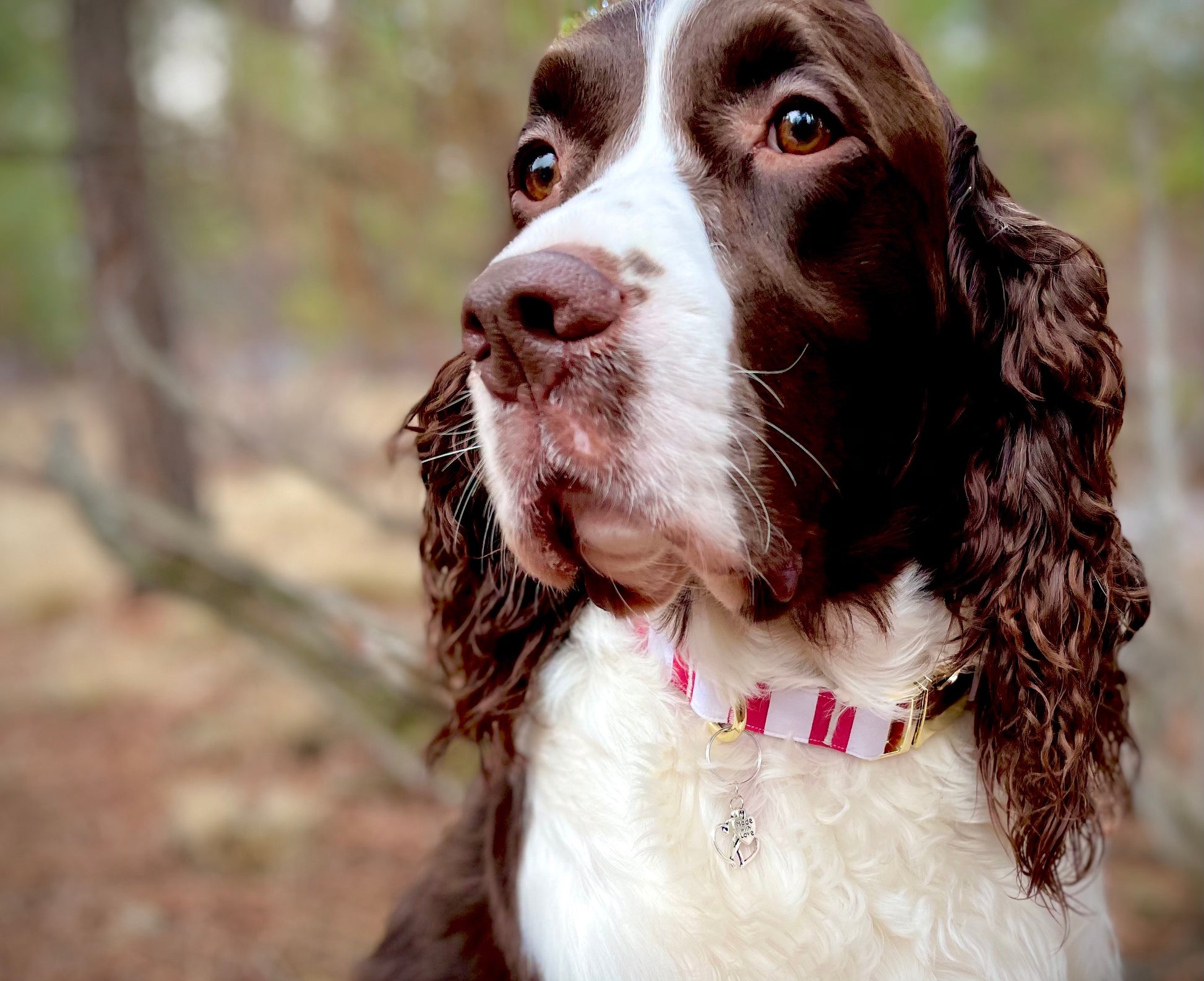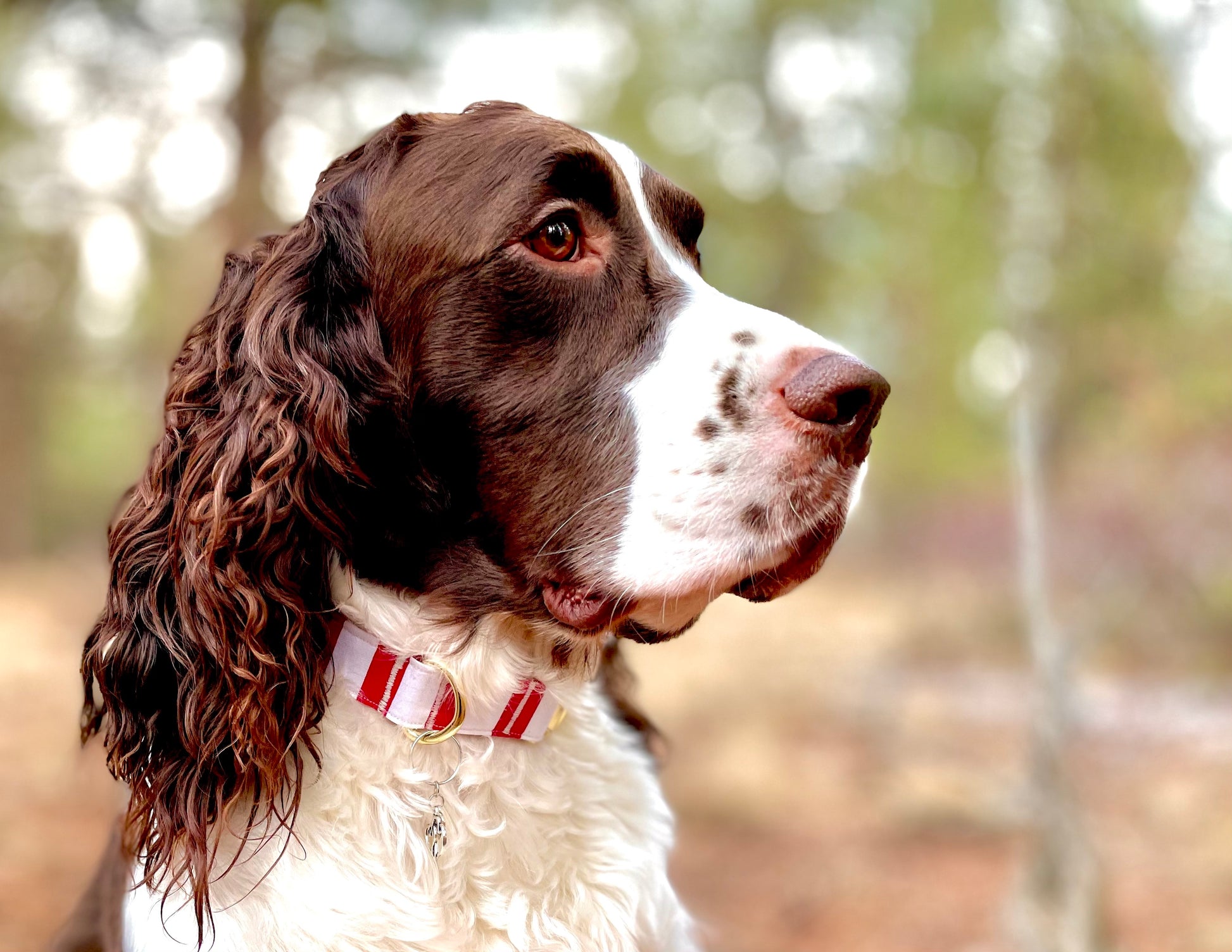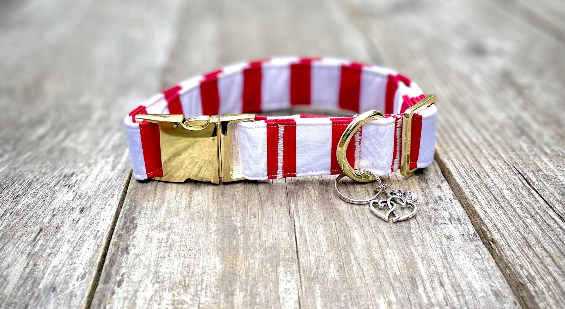 You’re gonna LOVE this collar. This striped collar is perfect for Valentine’s Day and is cute enough to wear all year-’round! The perfect red and white stripes emanate cheer and just the right amount of cuteness. This collar has a matching leash option, don't forget to check it out! Our leashes are 5-foot long, 1-inch wide, and come with a heavy-duty metal spring-loaded hook that attaches to the D-ring on your pet's collar. Each collar comes with a coordinating charm*. This hand-crafted collar is made with 100% cotton fabric and your choice of a metal or plastic buckle with a matching adjuster. Each collar is made with a reinforced metal D-ring. This elegant collar is sure to last for years.