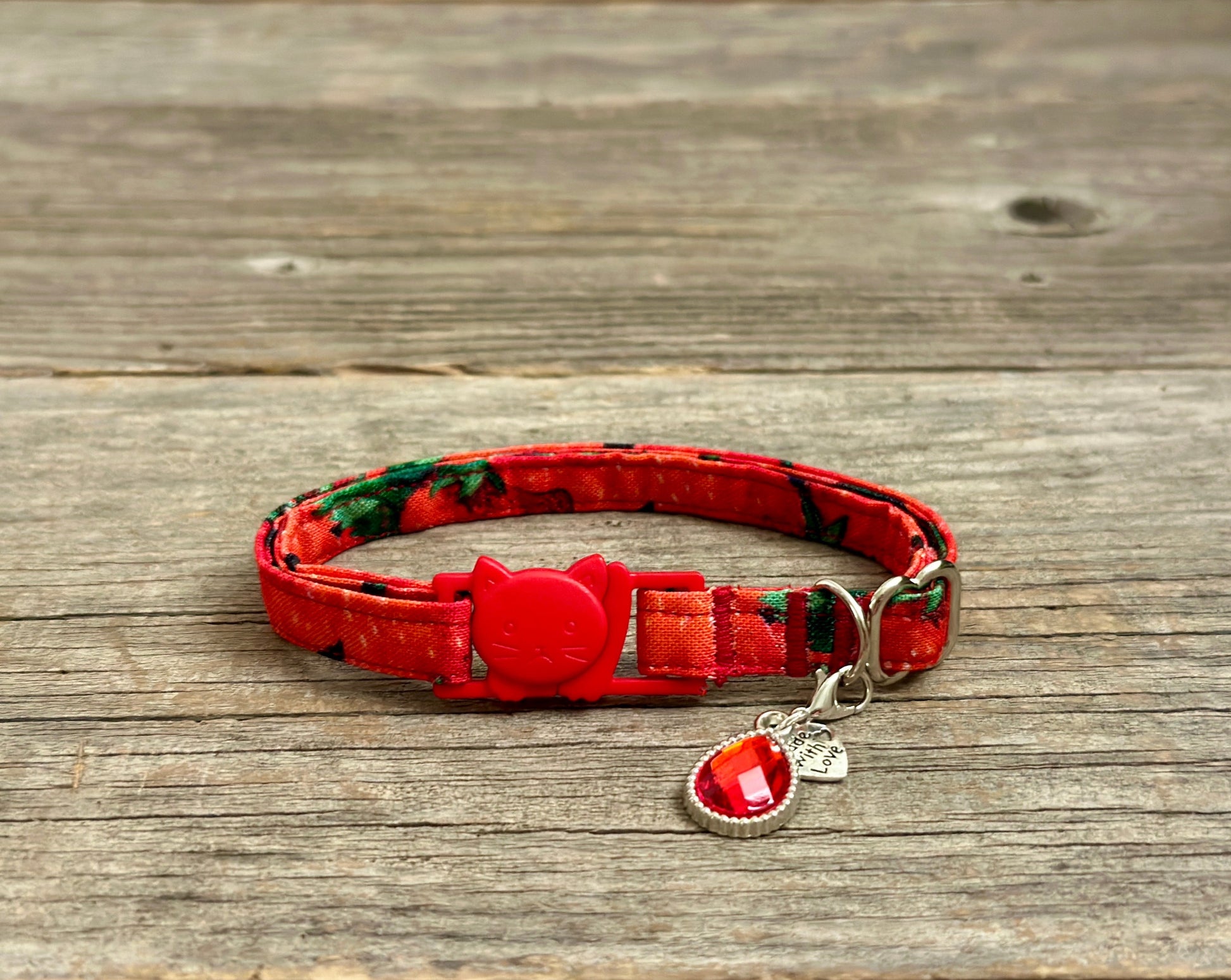 Our cat collars are 3/8" wide and have a plastic breakaway buckle.