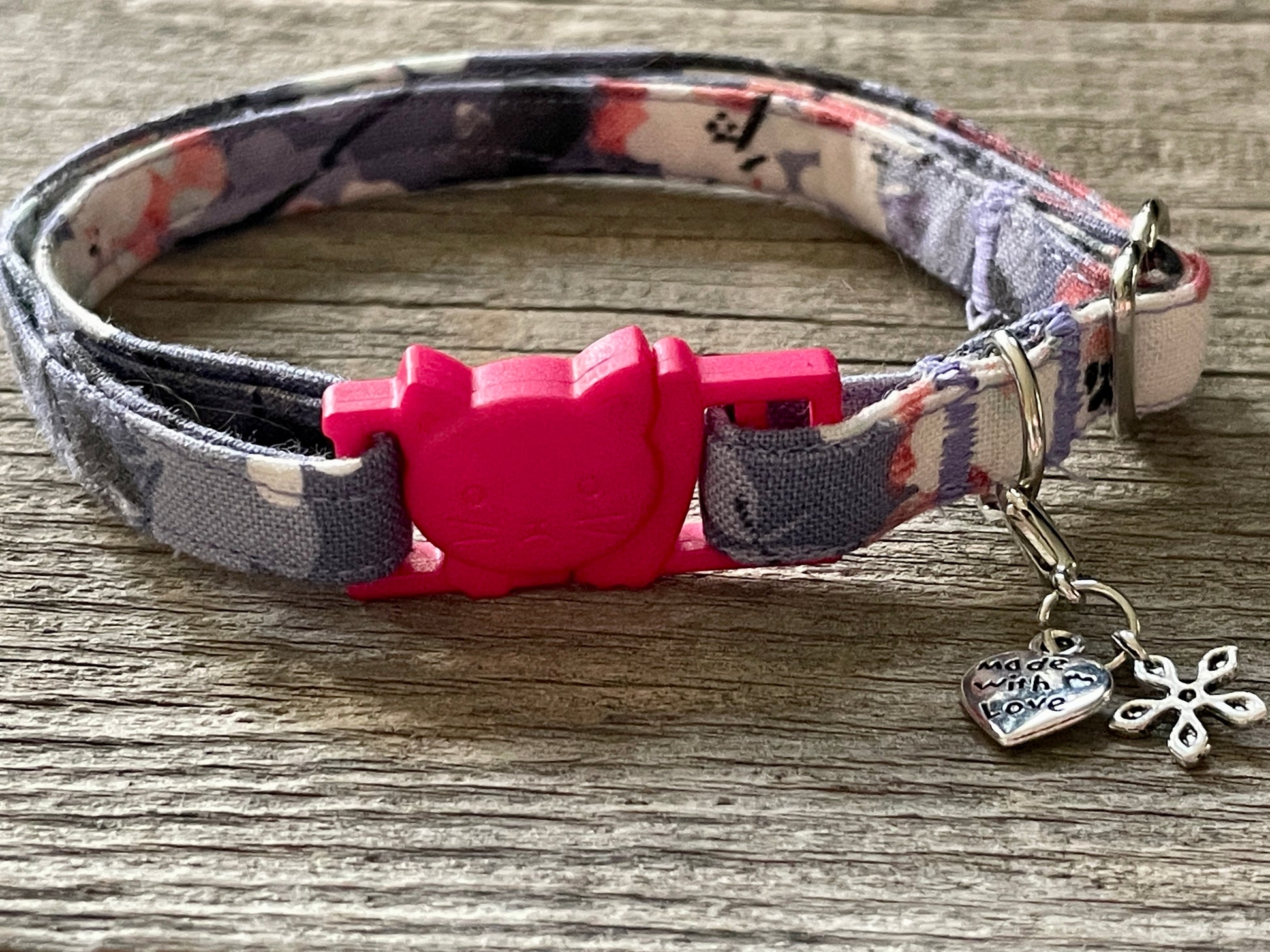 You’ll be enchanted by the delicate blossoms on this gorgeous collar. Designed for the sophisticated cat, this pretty fabric features a dark, dusty lilac, with peach and creamy white flower blossoms.