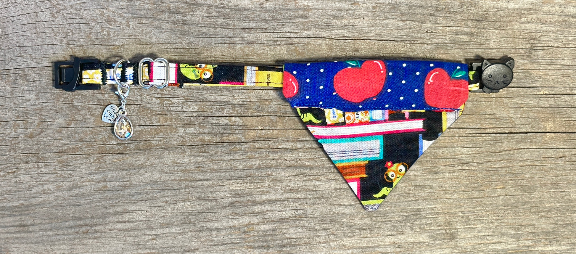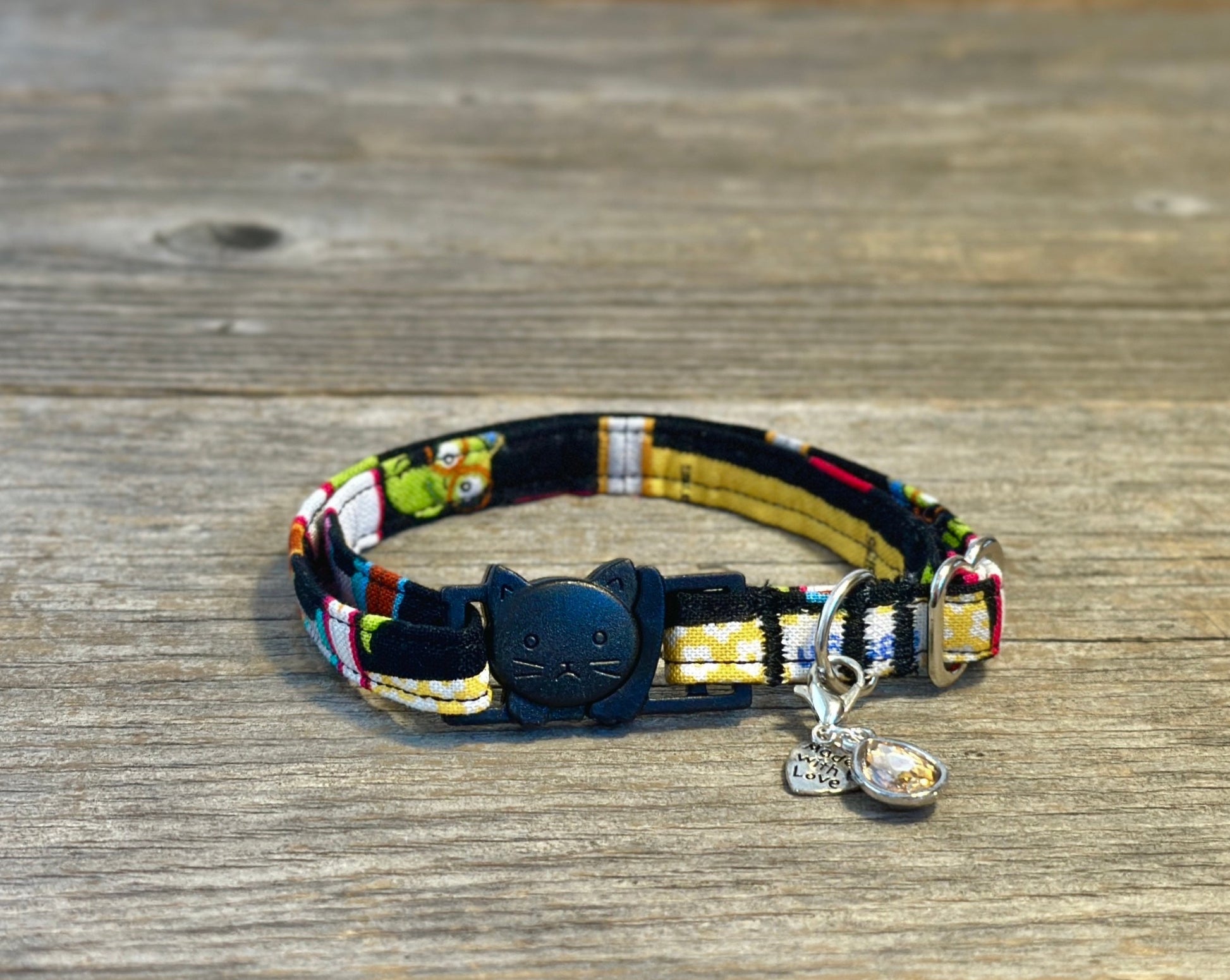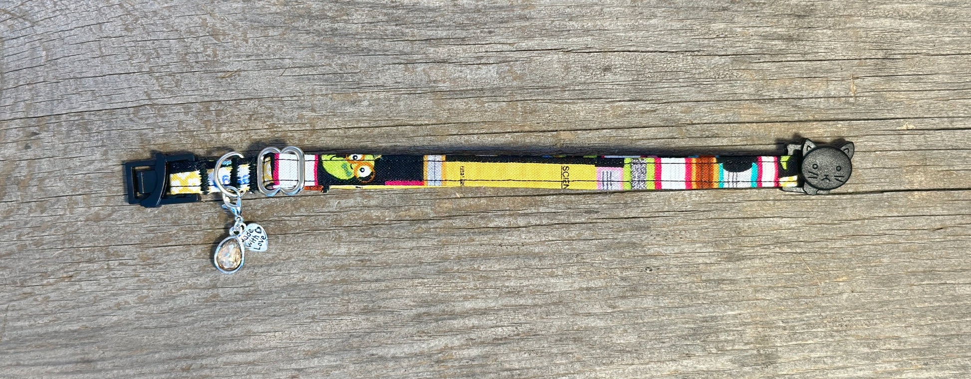 This collar is made out of 100% cotton fabric, making it easy to hand-wash! To wash, simply place it in warm, soapy water and gently rub the fabric. Rinse the collar, then dry it by laying it flat or by hanging it on a wire. If your cat has a little extra fun while wearing this collar, try using a stain-remover pen or spray.