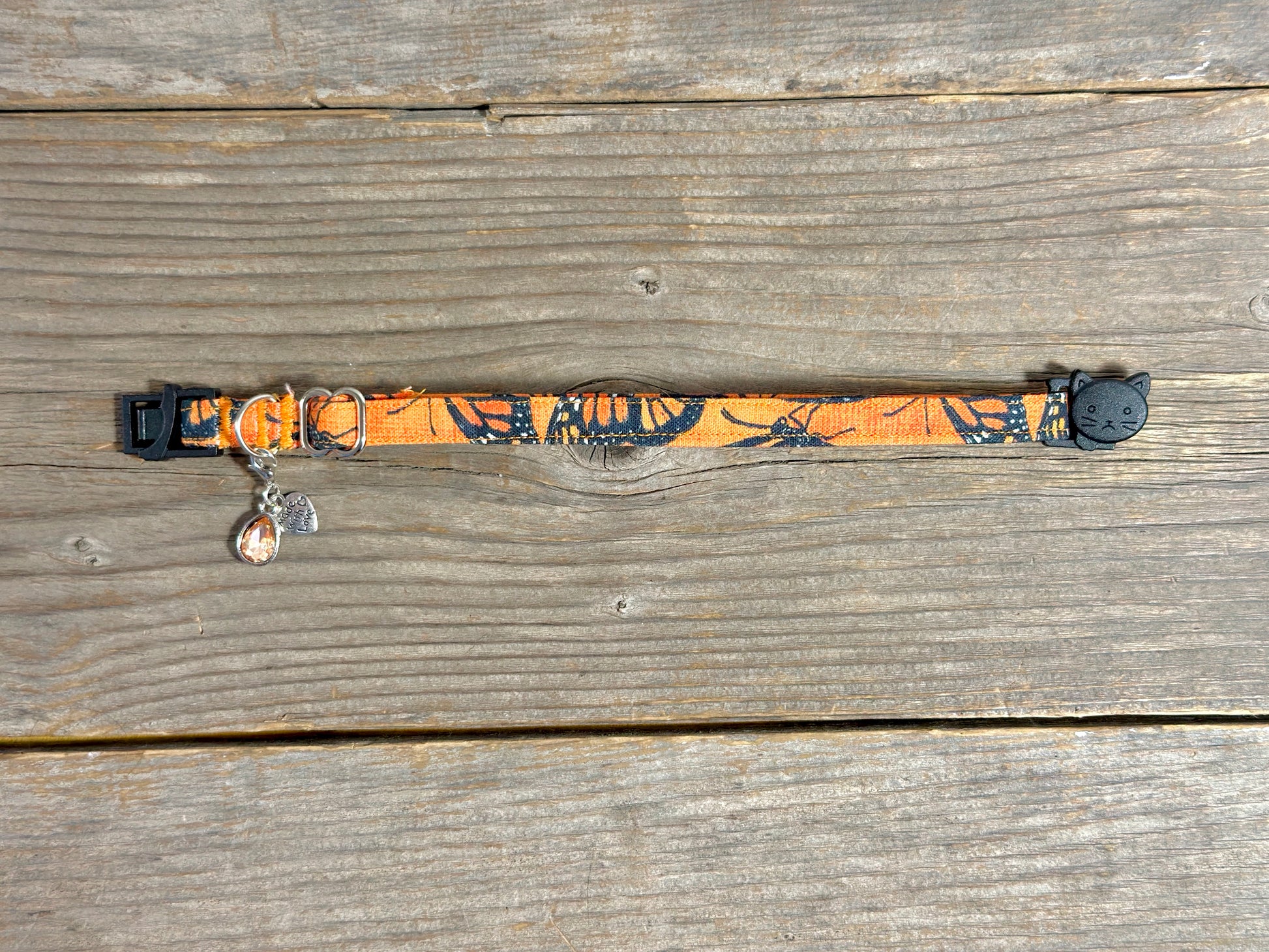 Our cat collars are 3/8" wide and have a plastic breakaway buckle.