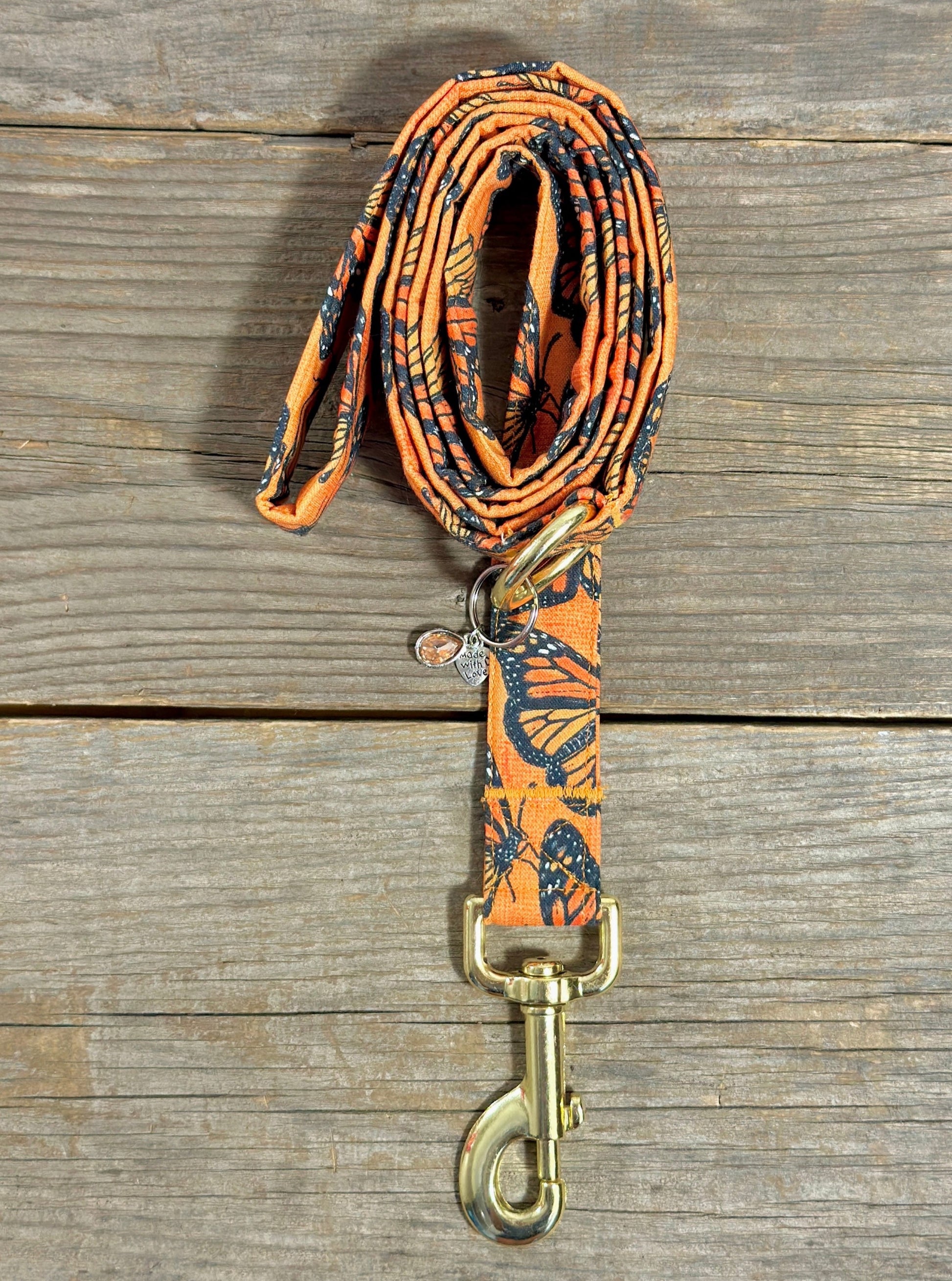 Our dog leashes are 1" wide and 5' long. Upon special request, we can make leashes longer or shorter. We can also make them 5/8" wide.