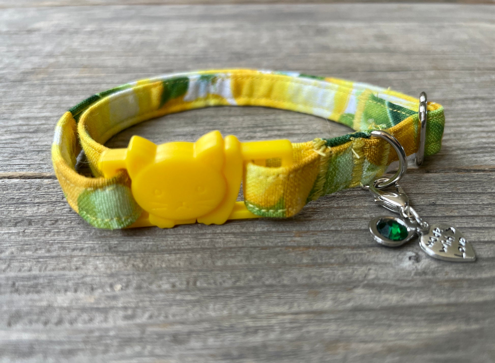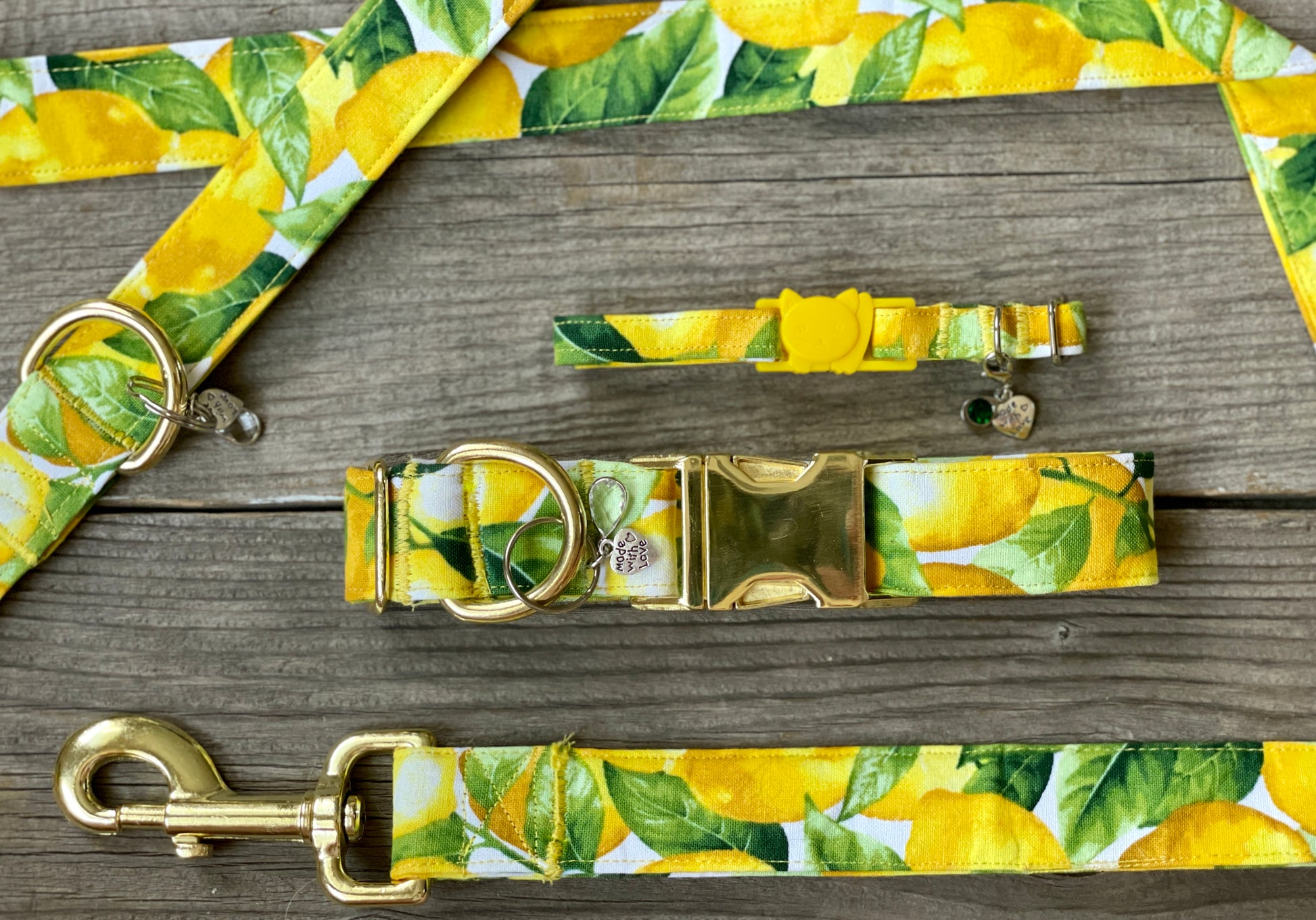 Picture this: it’s a hot summer’s day, you’re out on the front porch in a rocking chair, and the only thing that’s on your mind is an ice-cold glass of lemonade. Well, this lemon-themed collar can’t help but feel just as refreshing as a lemonade in summer. The mix of bright-happy yellow lemons, and lime and dark green leaves make for a perfect pairing. You can’t help but feel refreshed with this fabric.