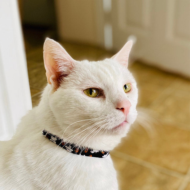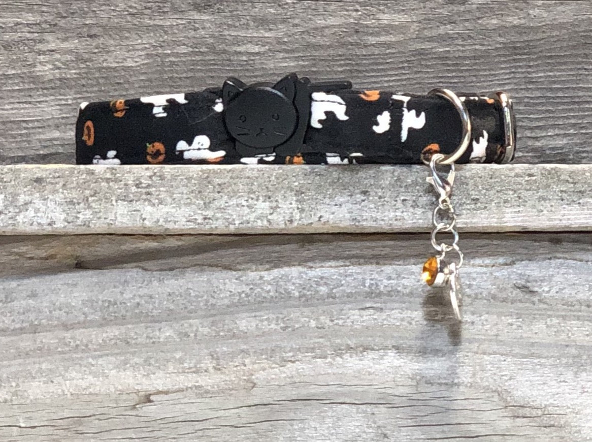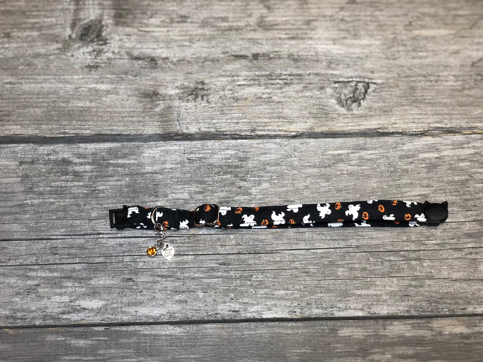 This spooktacular collar has a black background with ghosts and bright orange, happy jack-o-lanterns. This whimsical collar screams Halloween. Each collar comes with a coordinating charm*. This hand-crafted collar is made with 100% cotton fabric and a breakaway clasp. This elegant collar is sure to last for years.