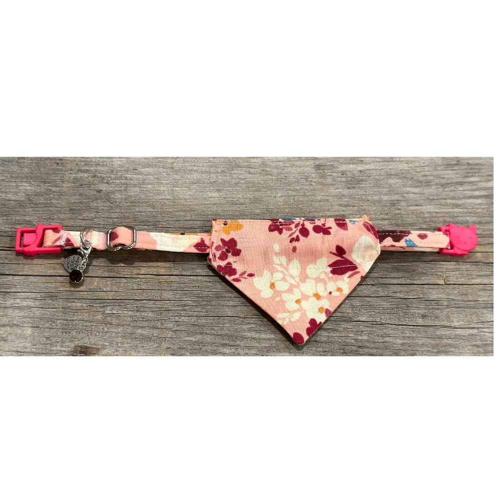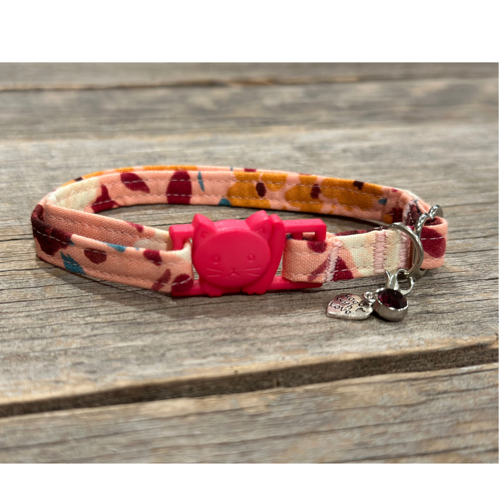 This Garden Party collar is adorned with cream, mustard yellow, and dark pink flowers, and it exudes a sense of timeless elegance and natural beauty. Make a statement at garden parties and outdoor events with this vibrant collar inspired by the beauty of spring. Let your cat stand out during leisurely walks in the park or garden, showcasing their unique style. This collar is sure to get compliments on how stunning it is and its color.