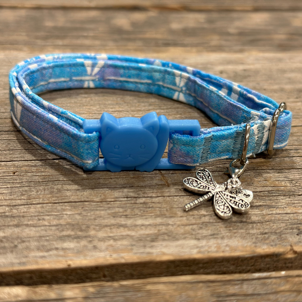 Step into the realm of the beauty of the Dragonfly Dreams Collar. Inspired by the delicate grace of dragonflies and the mesmerizing allure of watercolor artistry, this collar is captivating to any eye and looks stunning on any animal. The Dragonflies are adorned in hues of white, blue, and purple against a softly painted backdrop. These colors will make any dream come true.