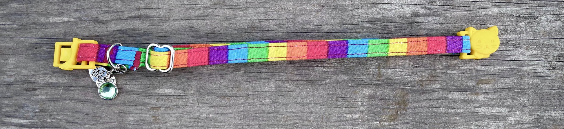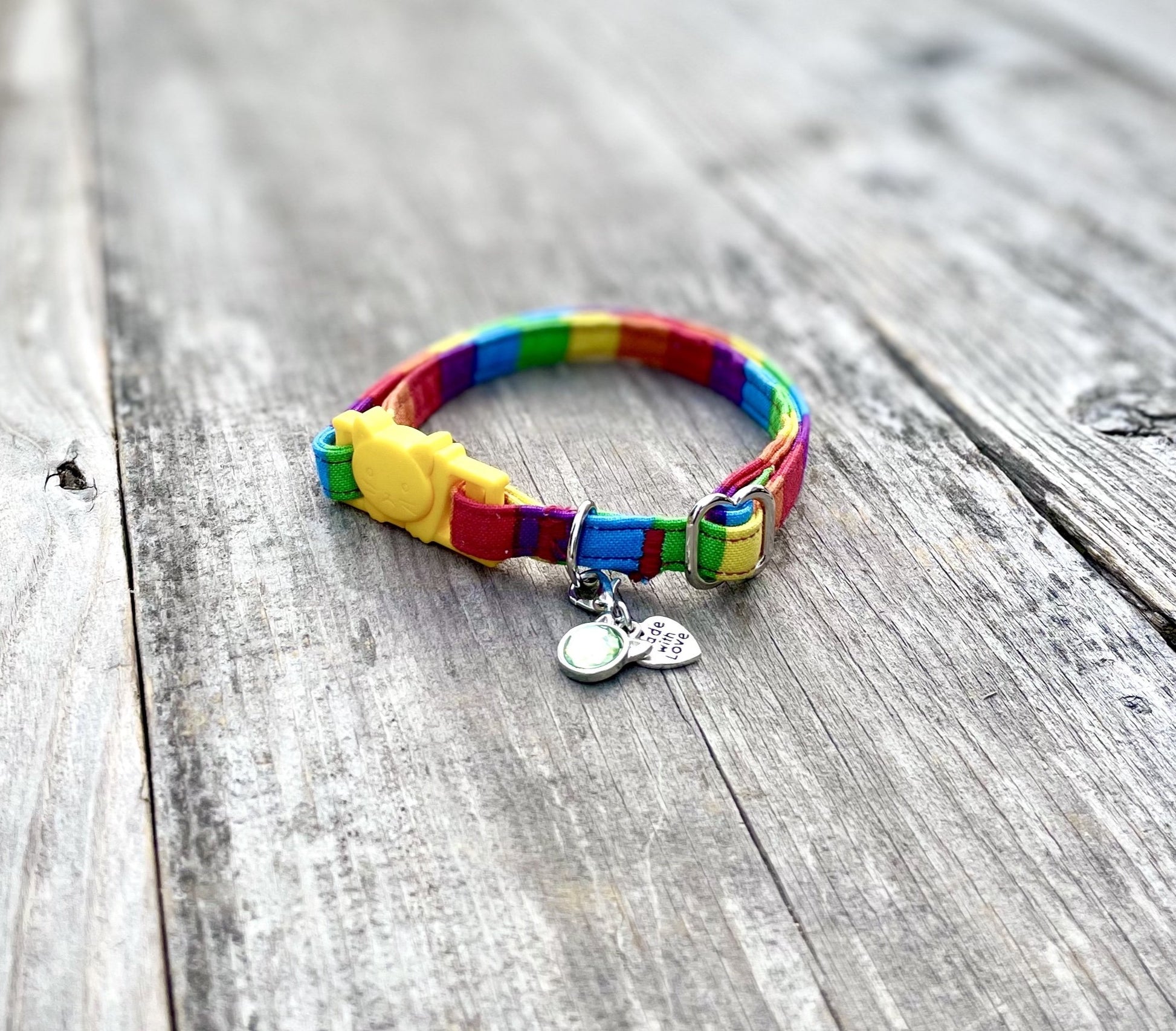 Celebrate good times, come on! Who doesn’t want to celebrate something special with their pup?! This collar is perfect for any dog that is in a party mood or going to any kind of celebration! This spunky collar features rainbow stripes of red, yellow, orange, green, blue, and purple! Each collar comes with a coordinating charm*. This hand-crafted collar is made with 100% cotton fabric and a breakaway clasp. This elegant collar is sure to last for years.