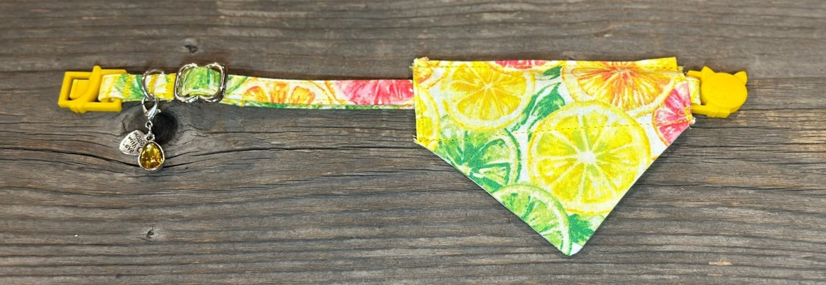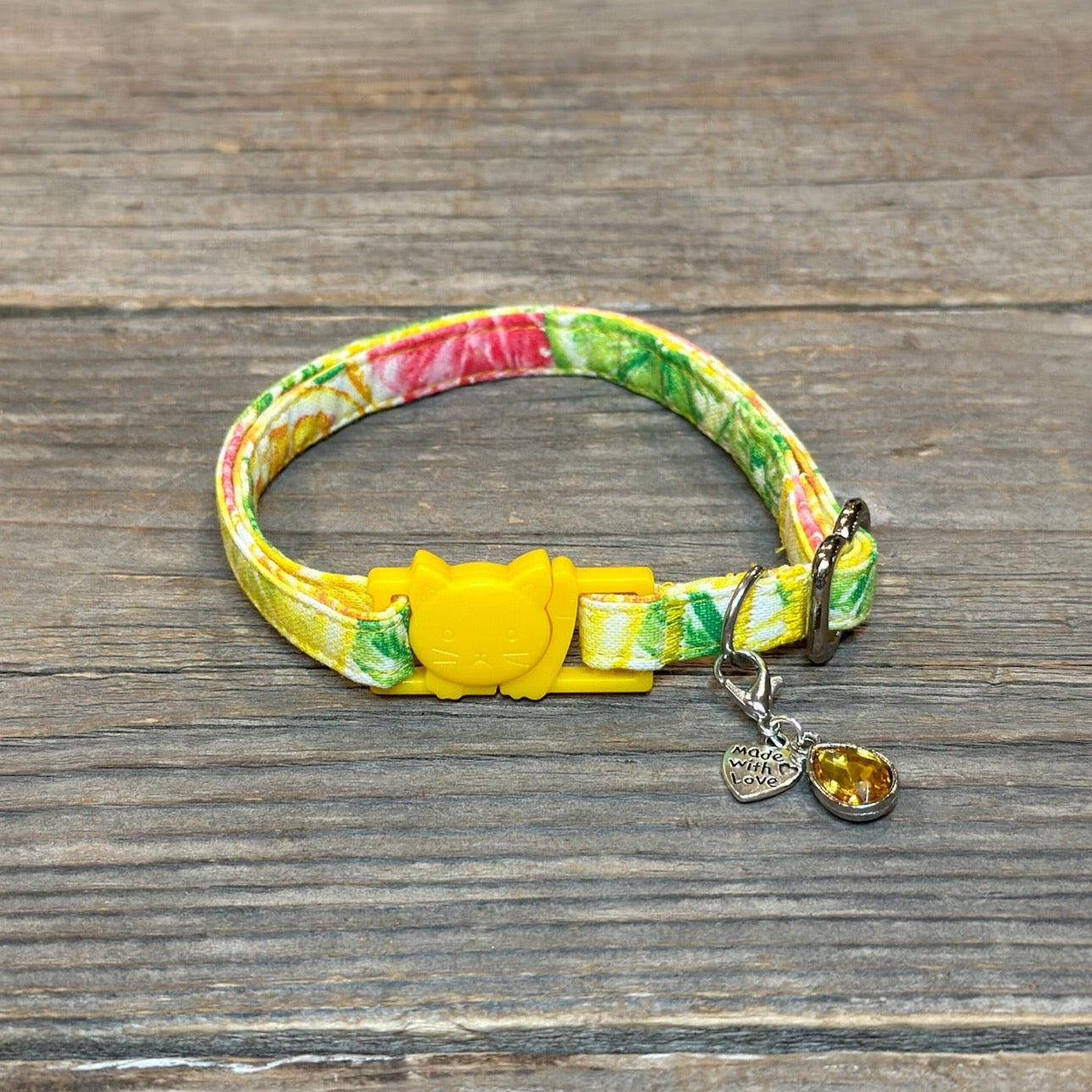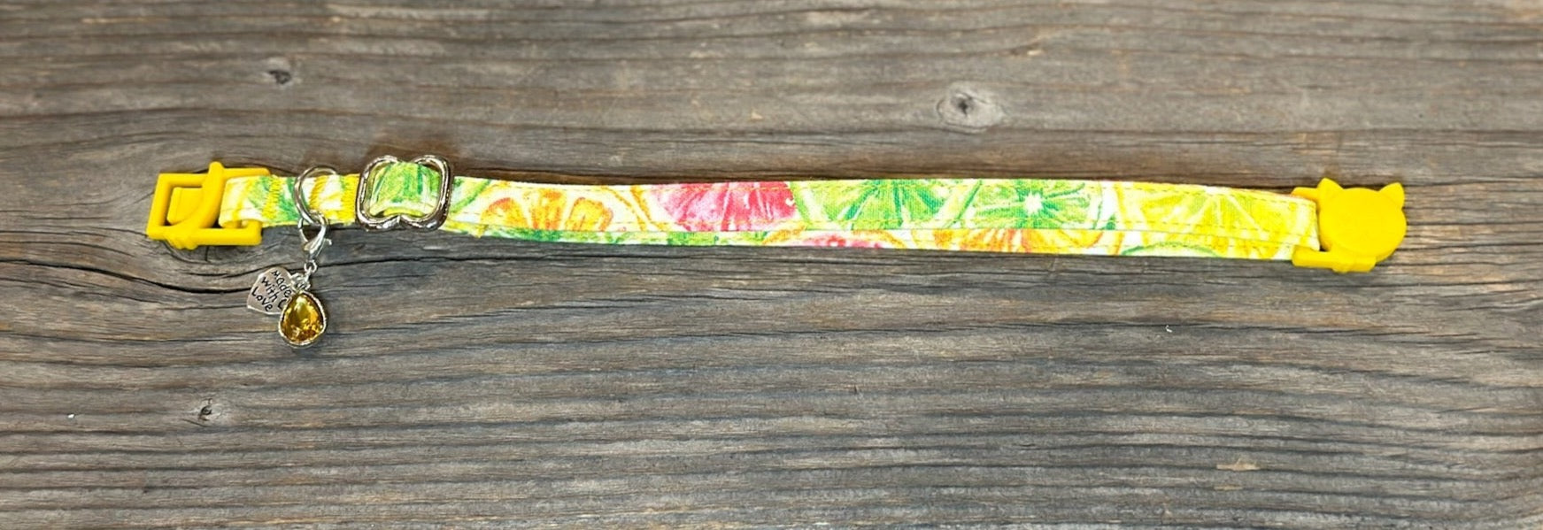 Our cat collars are 3/8" wide and have a plastic breakaway buckle.
