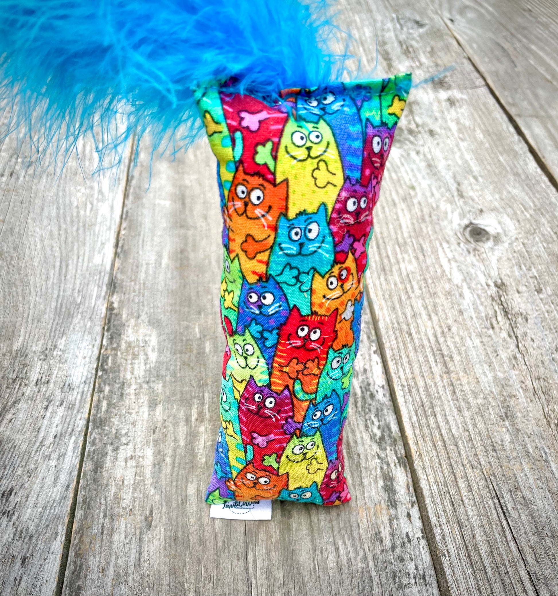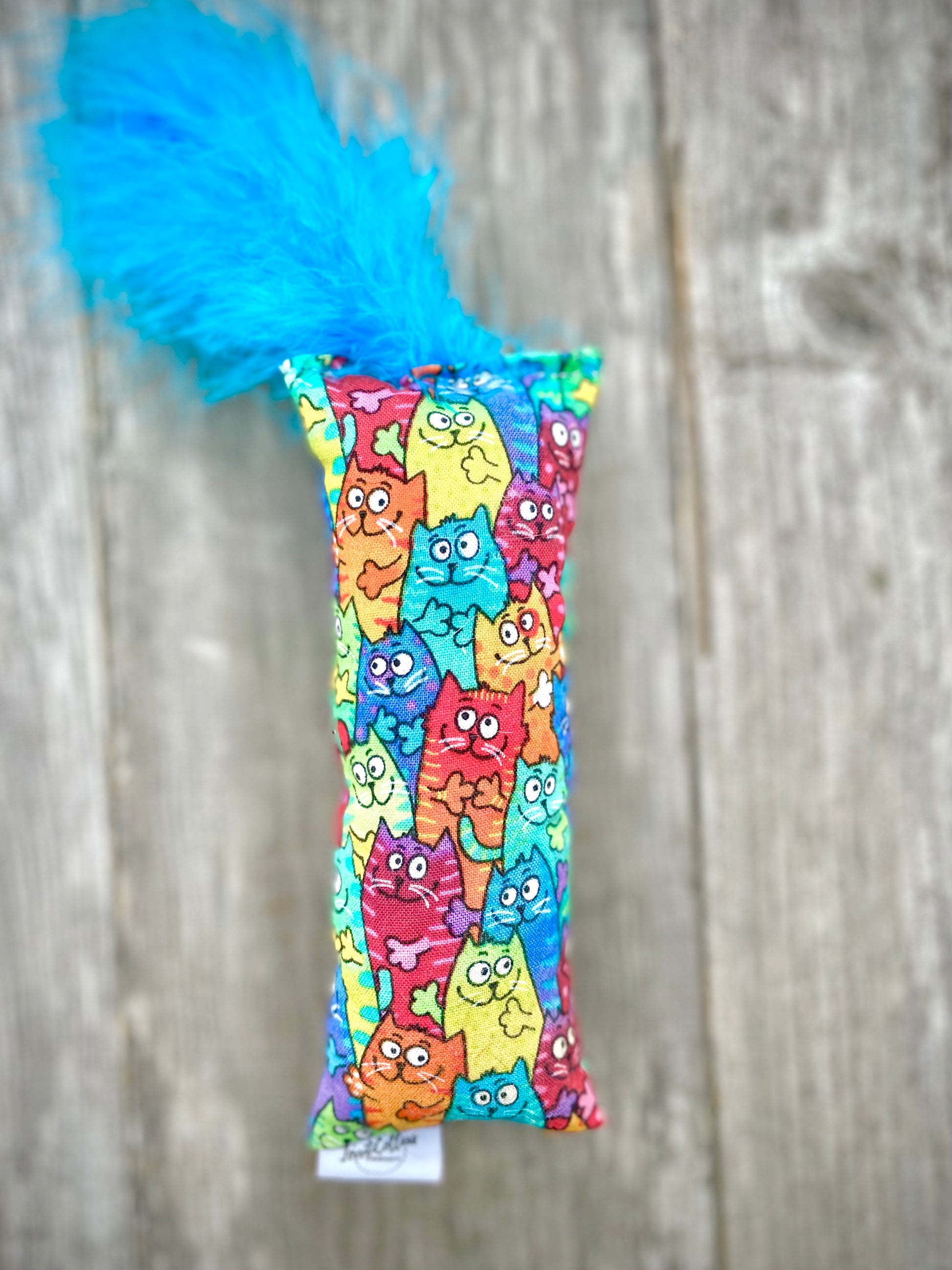 This adorable kitty kicker is covered with oodles of colorful cats! These happy cats vary in color from red, blue, yellow, orange, and green. This kicker is sure to bring joy to any cat who plays with it. It is made with cotton fabric and has feathers on the top to ensure extra fun!