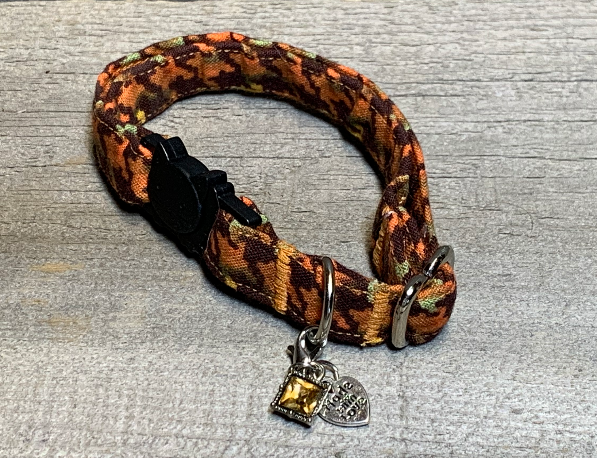 This collar brings back the nostalgia of sitting on grandma’s couch while waiting for Thanksgiving dinner and homemade pumpkin pie. This collar is perfect for a dressed up feast, but casual enough for a nap on the couch. This collar gives off vintage vibes with its orange, brown, and auburn houndstooth pattern. Each collar comes with a coordinating charm*. This hand-crafted collar is made with 100% cotton fabric and a breakaway clasp. This elegant collar is sure to last for years.