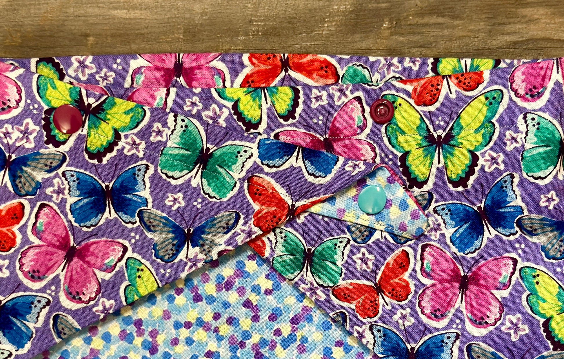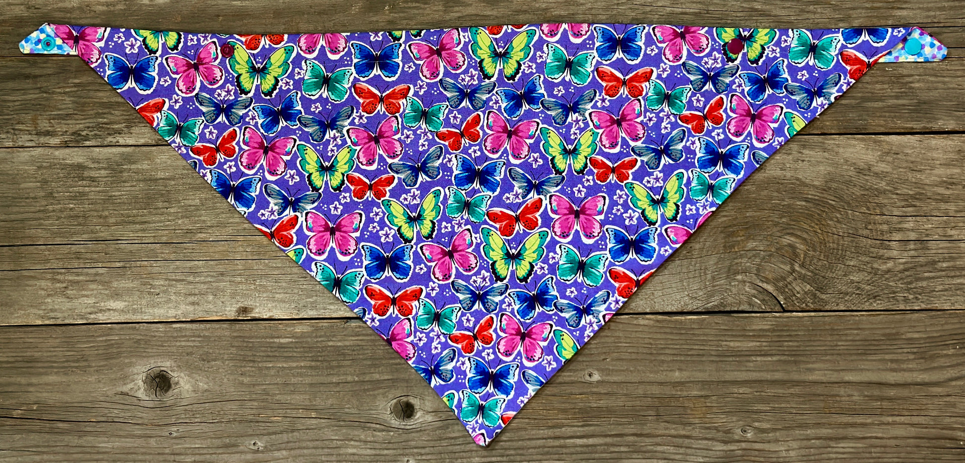 Every fashionable pup needs a matching bandana! This adorable bandana is double-sided! For some extra cuteness, buy one of the matching dog collars. This bandanna is "Hyacinth Blooms" and butterflies. The tie strip of the bandana is 30" long and has snaps for adjustability. If you'd like a different pairing, just leave us a message in the order notes.