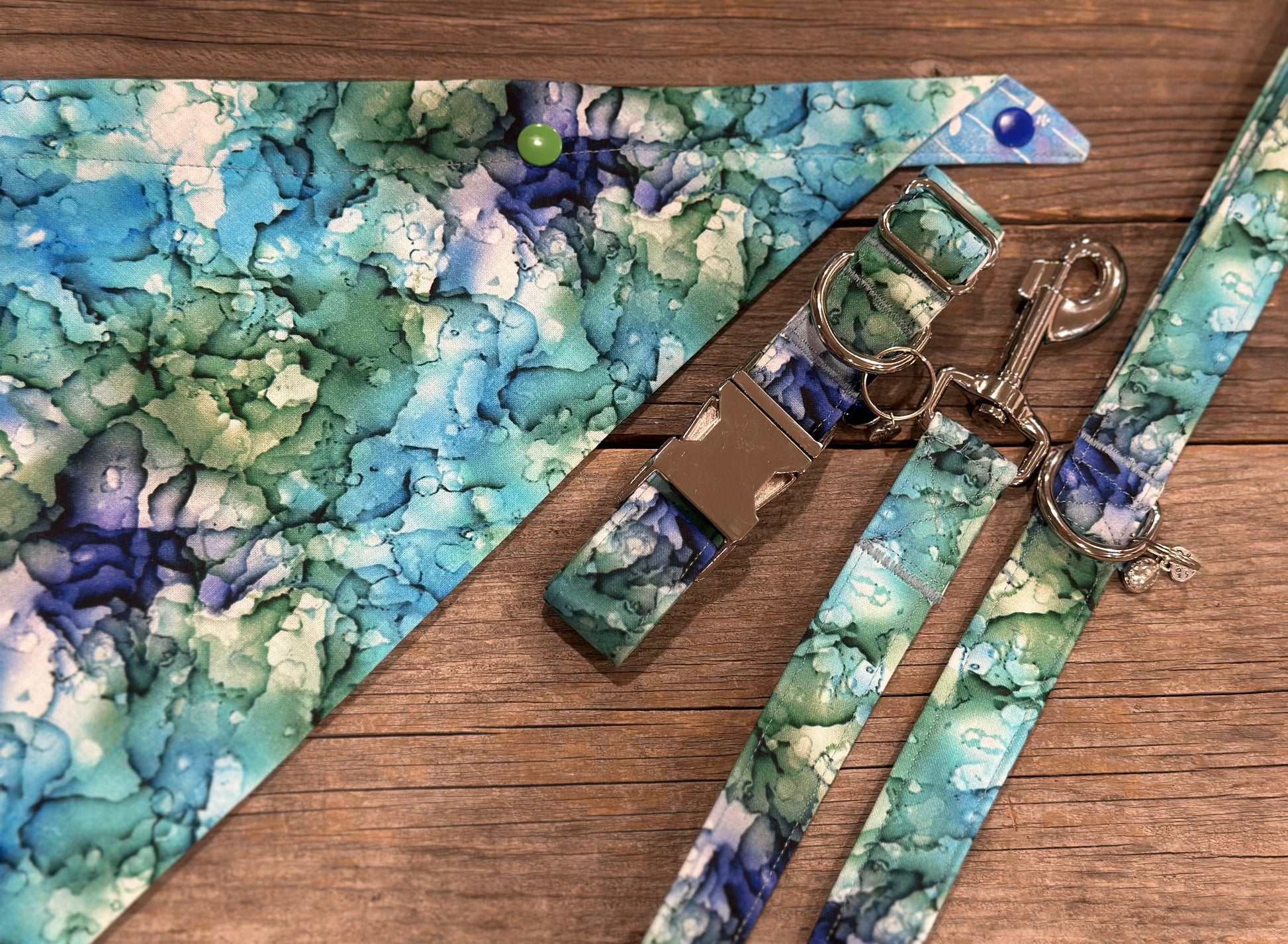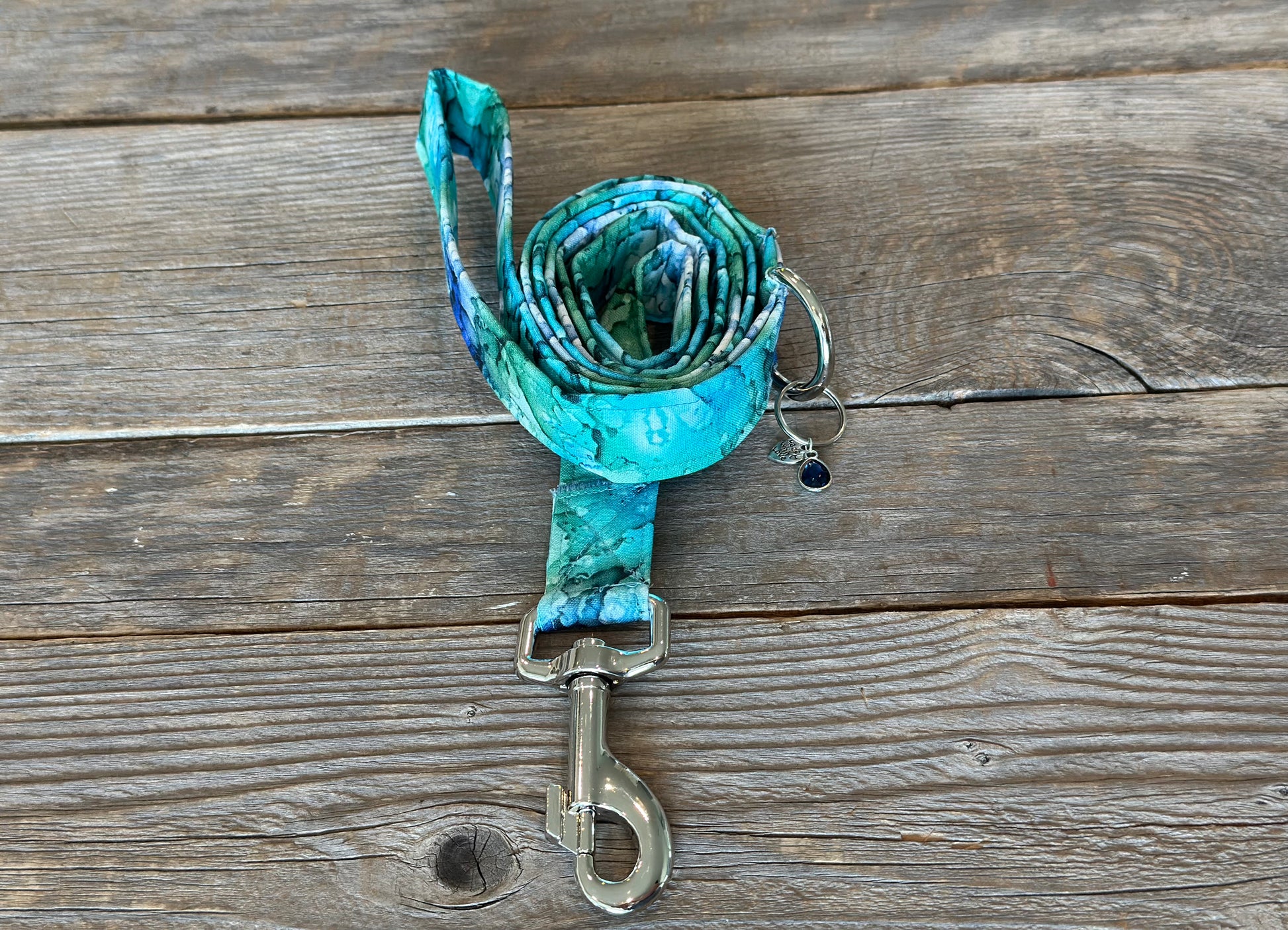 The Splash Down leash are shades of blue cascade and meld; they evoke the boundless depths of the ocean, inviting you to immerse yourself in its cool embrace of the vast canvas of nature, where hues mingle of blues, greens, light blues, and white that form the essence of a splash. Immerse yourself in its depths, and let the colors of Splash Down wash over you like a gentle tide. This collar is perfect for any beach day or for any occasion.