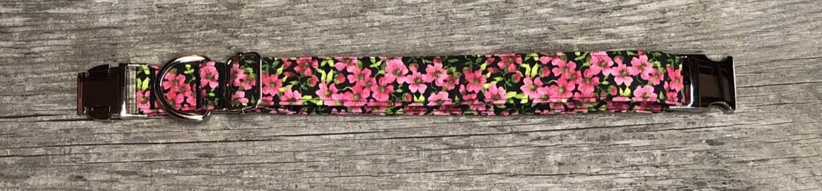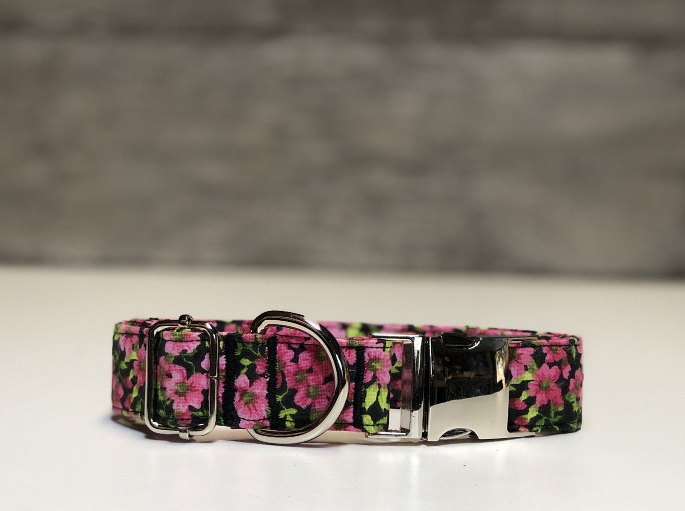 Named after our very first customer, this collar holds a special place in our hearts. This sweet, feminine collar features delightful light and bright pink flowers, with green leaves on a true black background. You can’t help but smile when you see this collar. Each collar comes with a coordinating charm*. This hand-crafted collar is made with 100% cotton fabric and your choice of a metal or plastic buckle with a matching adjuster. Each collar is made with a reinforced metal D-ring. This elegant collar is sure to last for years.