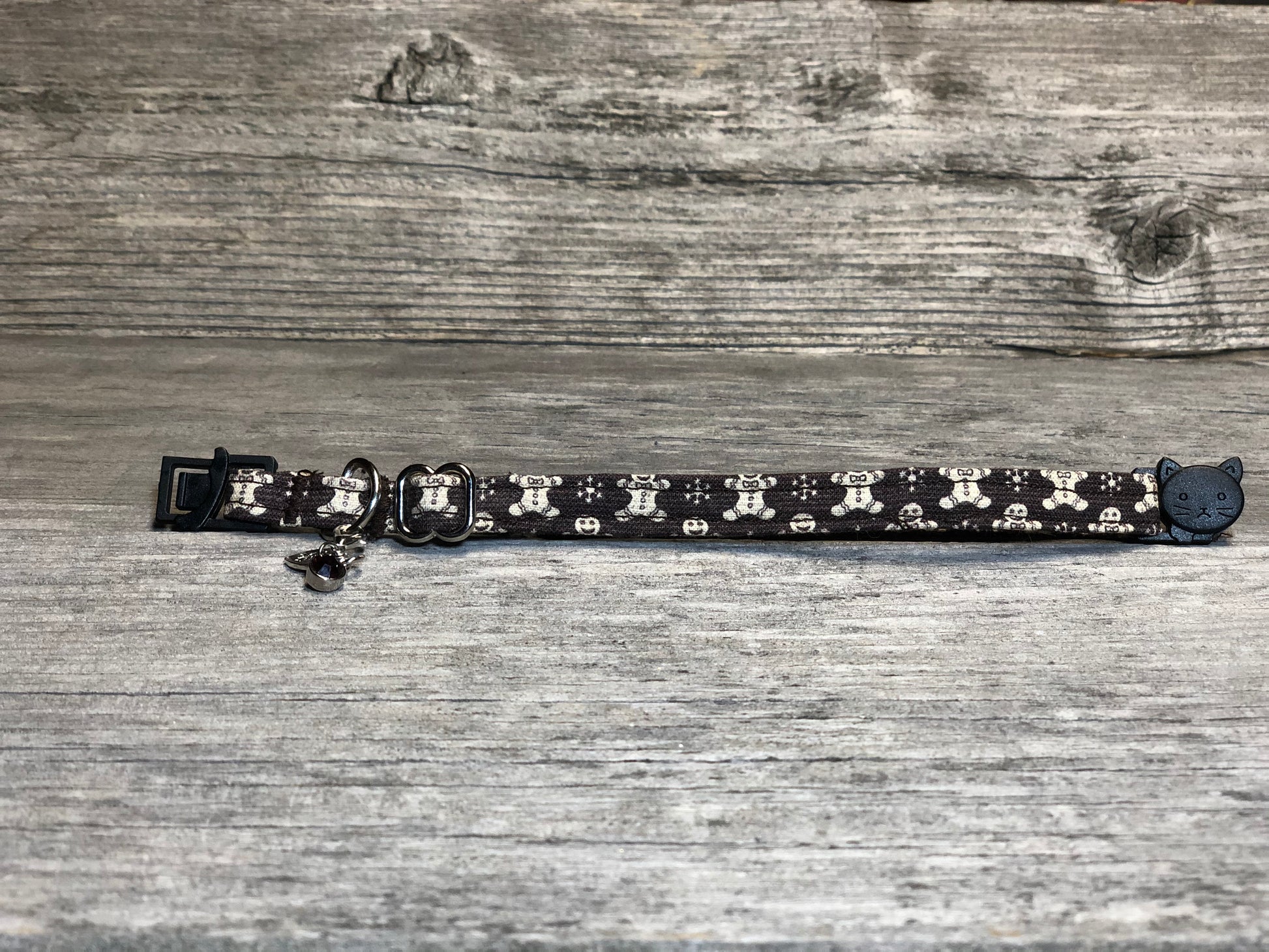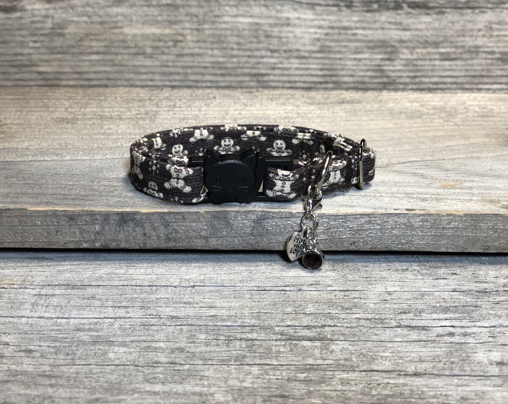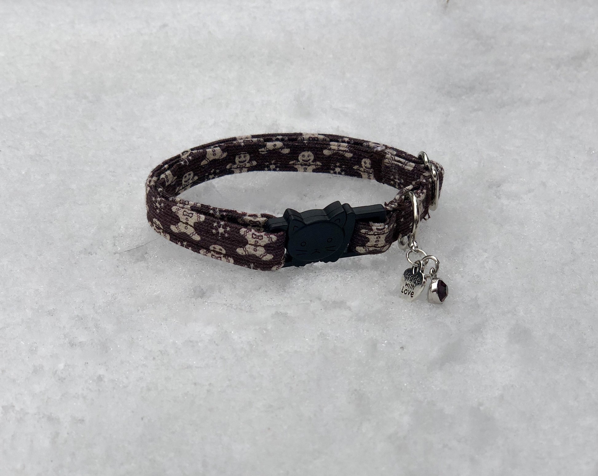 Sugar and spice makes this collar nice. You’ll love the cute gingerbread men and snowflakes on their mocha background. You can’t help but be in the holiday spirit while wearing this collar. Each collar comes with a coordinating charm*. This hand-crafted collar is made with 100% cotton fabric and a breakaway clasp. This elegant collar is sure to last for years.