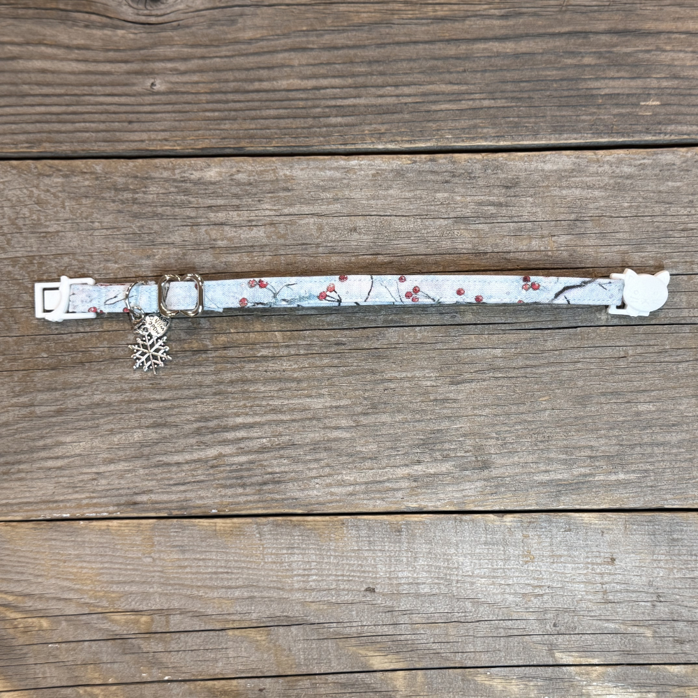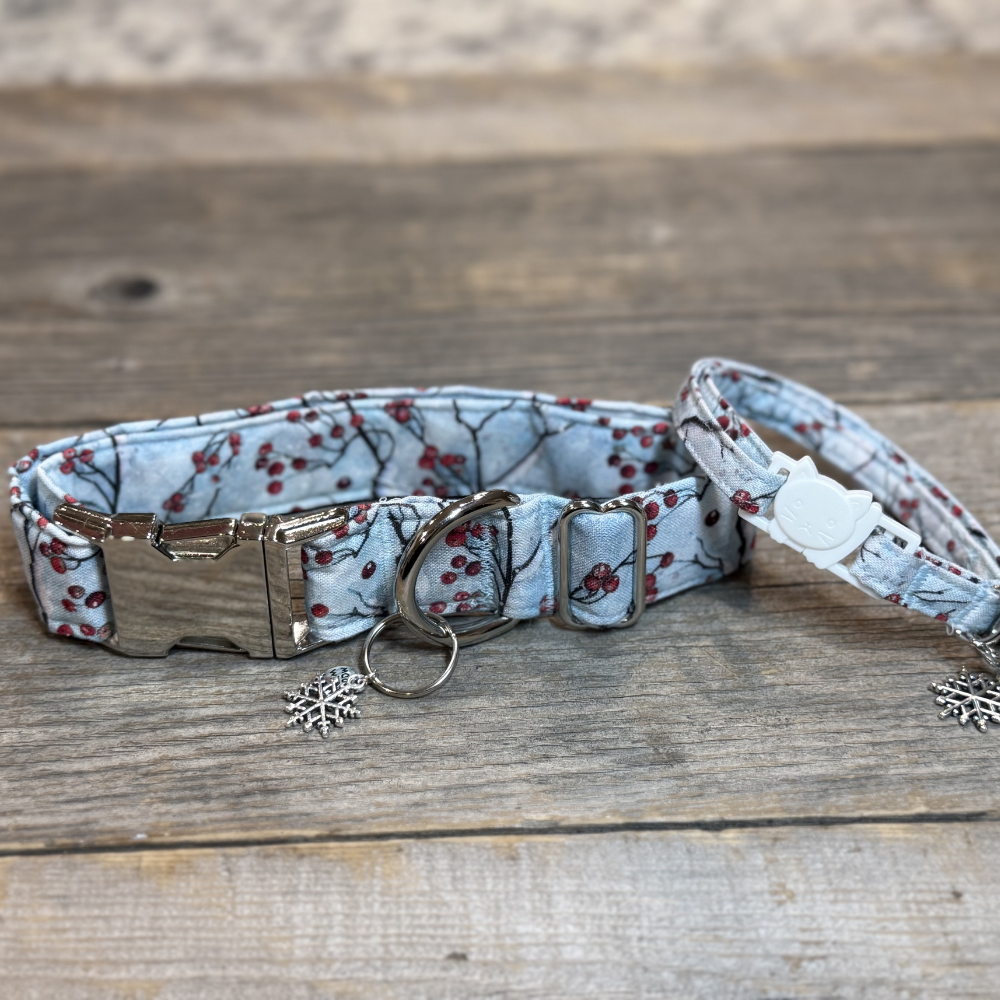 Embrace the serene elegance of the season with the Winterberry Bliss. This exquisite piece captures the quiet beauty of a winter's day, featuring delicate branches laced with bright red berries against a soft, frosty blue background that evokes the magic of freshly fallen snow. The intricate design brings to life the peaceful stillness of a winter landscape, making it the perfect accessory for pets who appreciate a touch of sophistication. Winterberry Bliss is a timeless blend of beauty and tranquility, adding a gentle, festive charm to any holiday gathering or wintry walk.