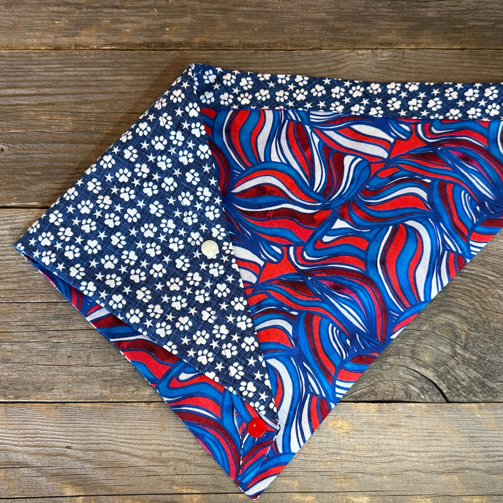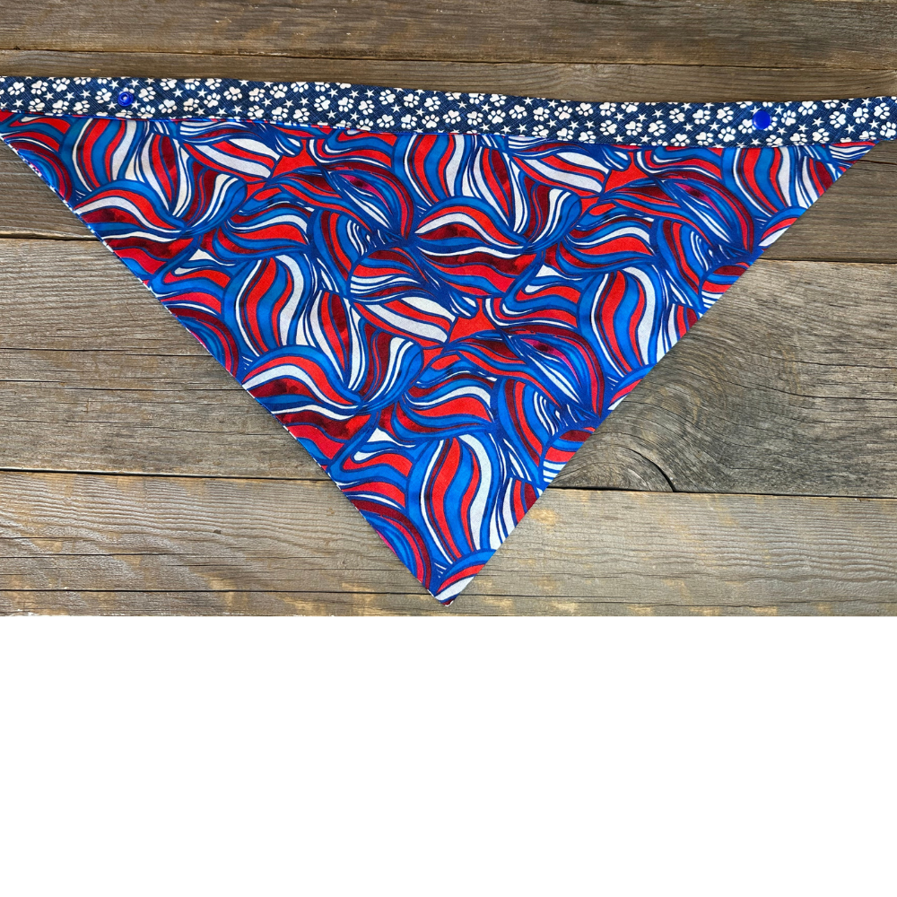 Adorned with dynamic waves of reds, white, and blues, this pattern combines eye-catching style with classic Americana. This vibrant design is a tribute to the patriotic spirit and costal elegance. Whether your pet is lounging at home or exploring the outdoors, they’ll make a statement with every step. This design is perfect for any patriotic occasion or everyday wear. This bandana is 'Paw-ty in the U.S.A.' and 'Red, White, and Wave' The tie strip of the bandana is 30" long and has snaps for adjustability. If you'd like a different pairing, just leave us a message in the order notes.