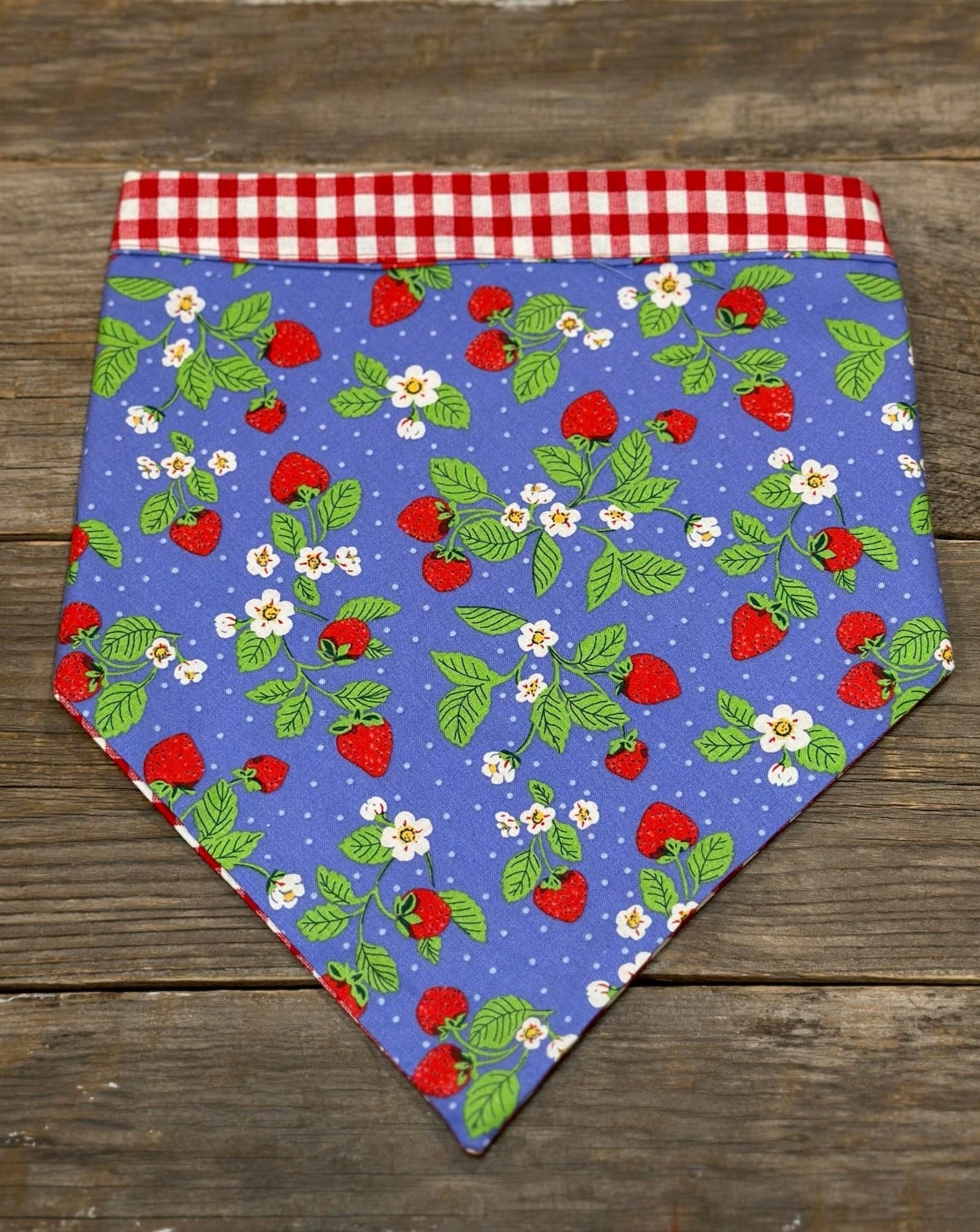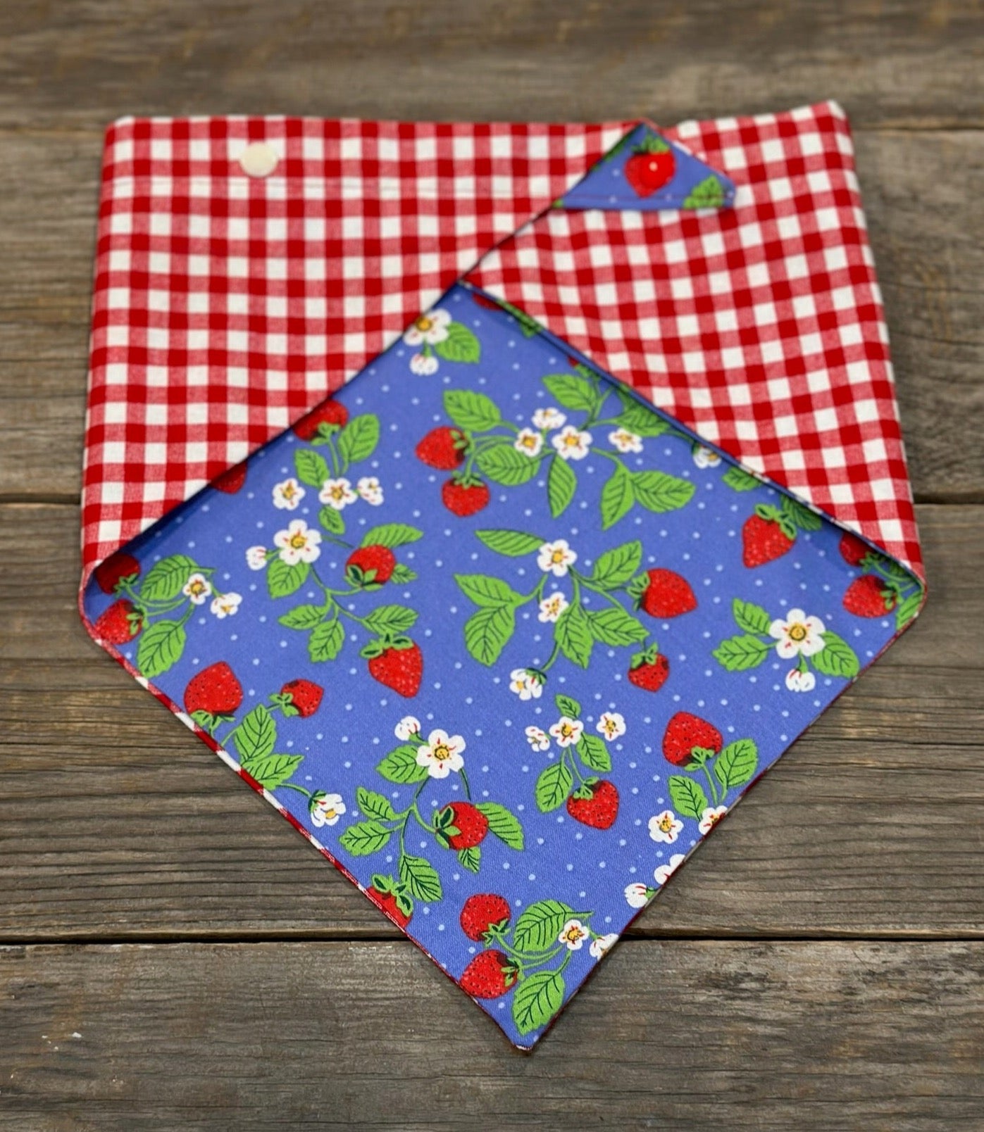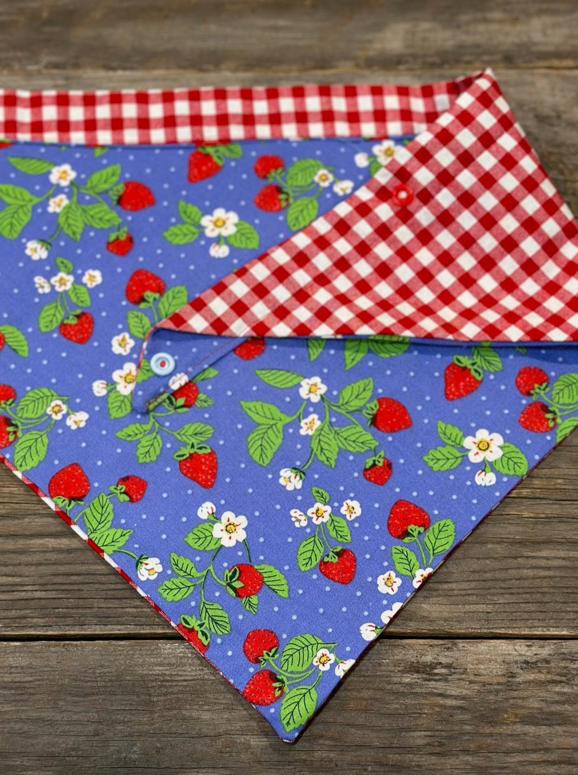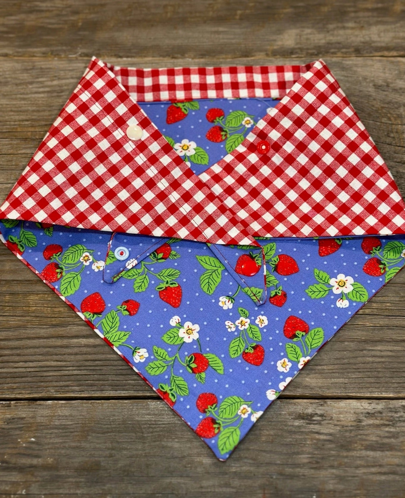 This bandana is 'Strawberry Daiquiri' and 'Picnic for Two.' The tie strip of the bandana is 30" long and has snaps for adjustability. If you'd like a different pairing, just leave us a message in the order notes.
