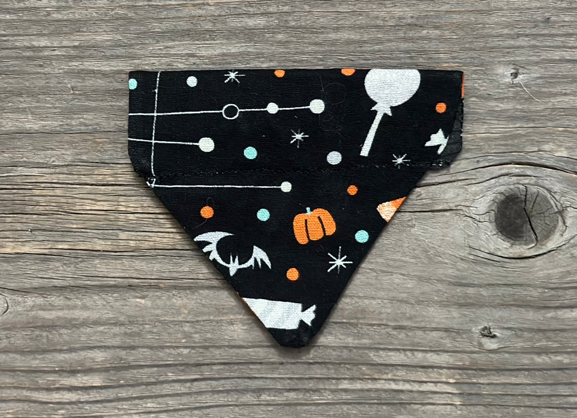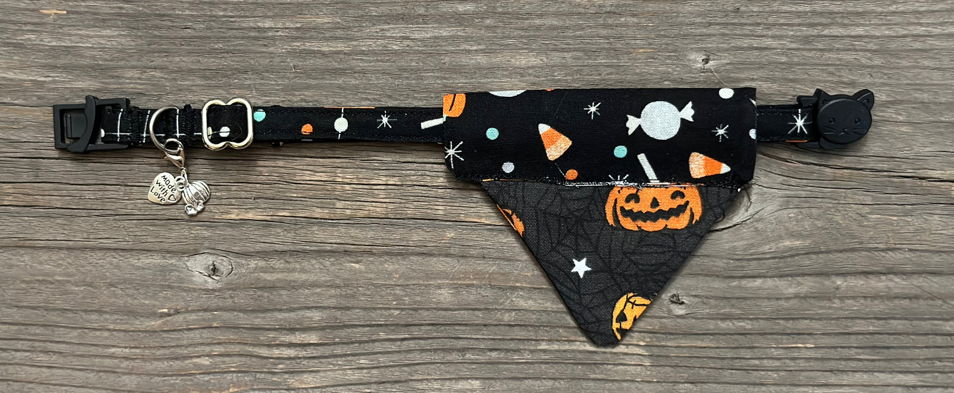 This adorable cat bandanna slides right onto your cat collar. For some extra cuteness, buy the matching cat collars. This bandanna is 'Halloween Haul' and 'Pumpkin Palooza.' If you'd like a different pairing, just leave us a message in the order notes.