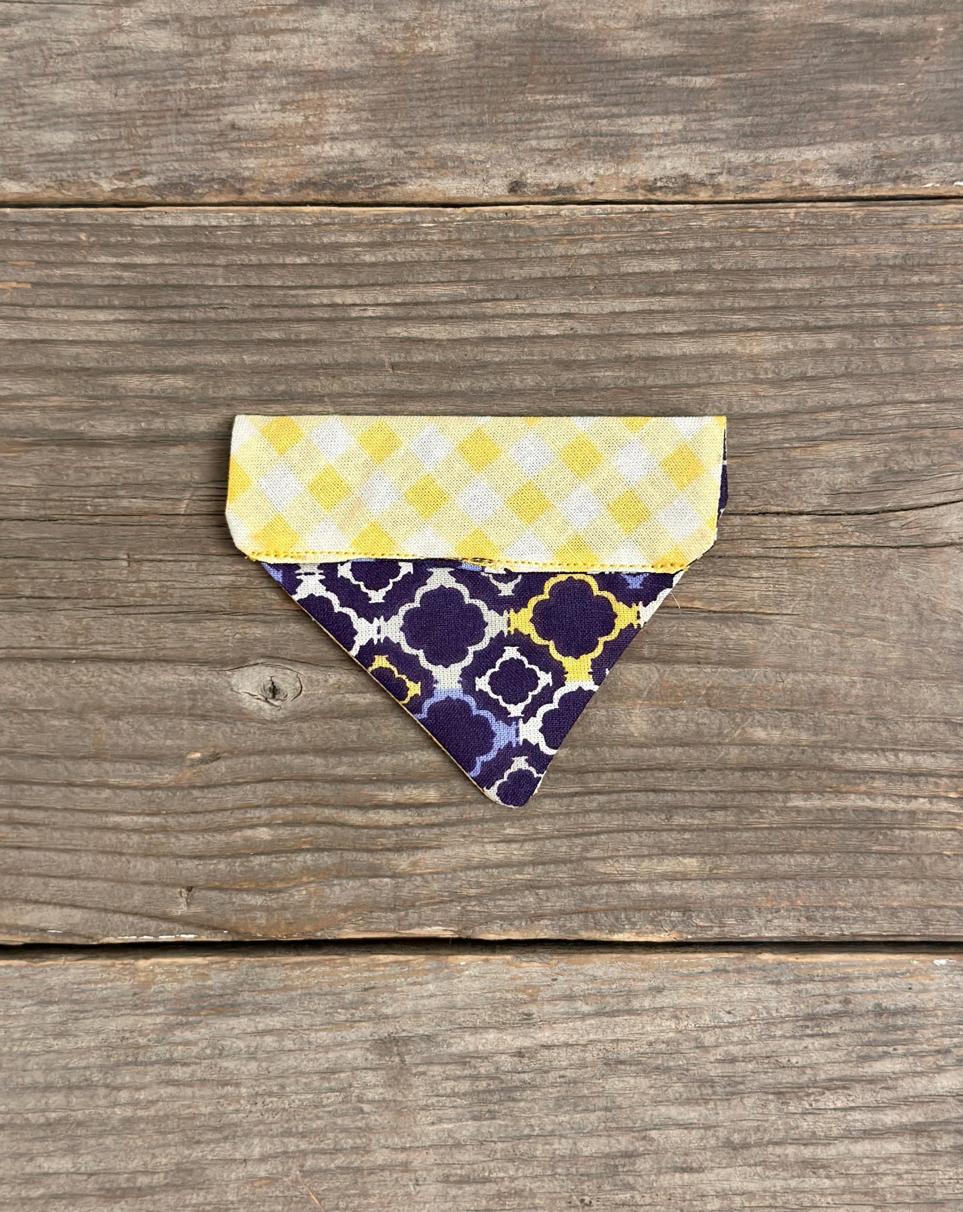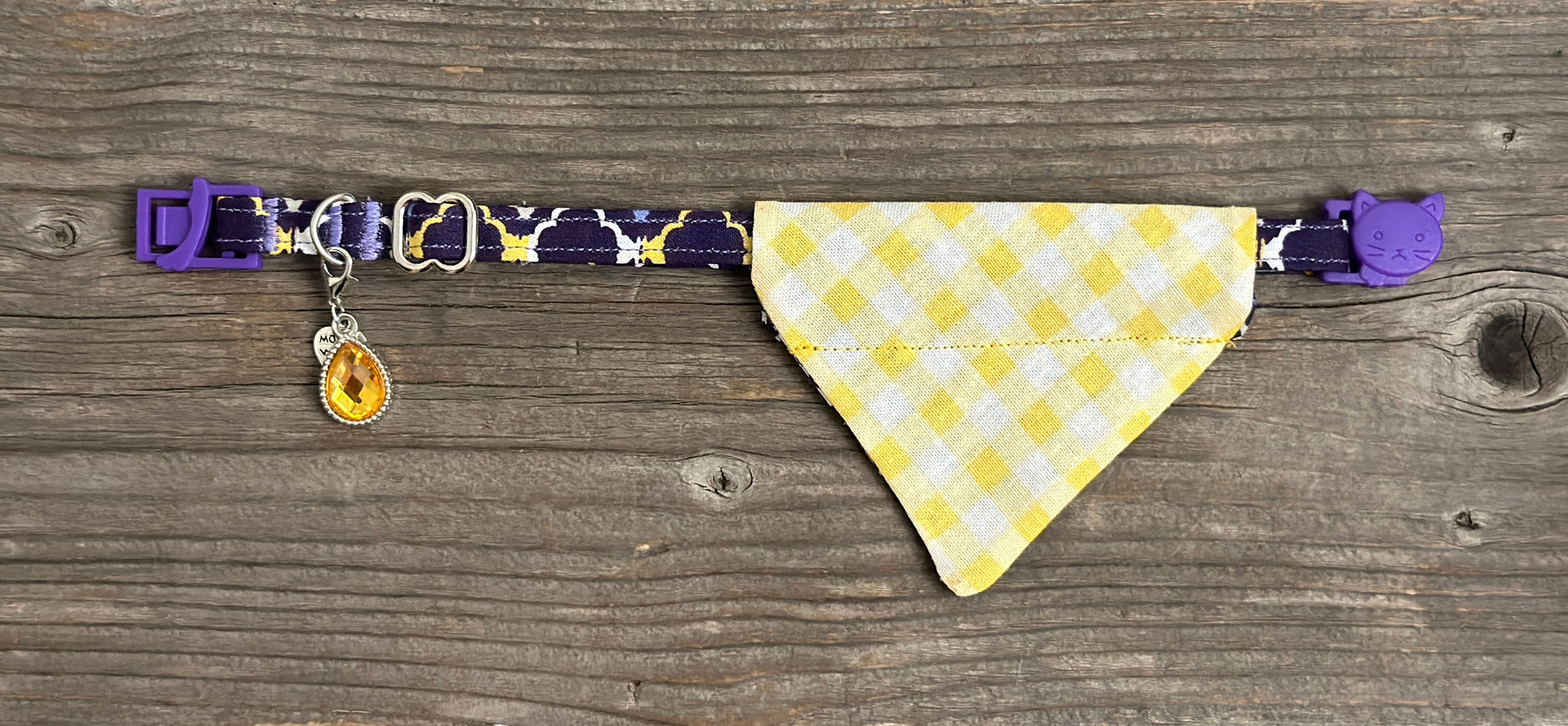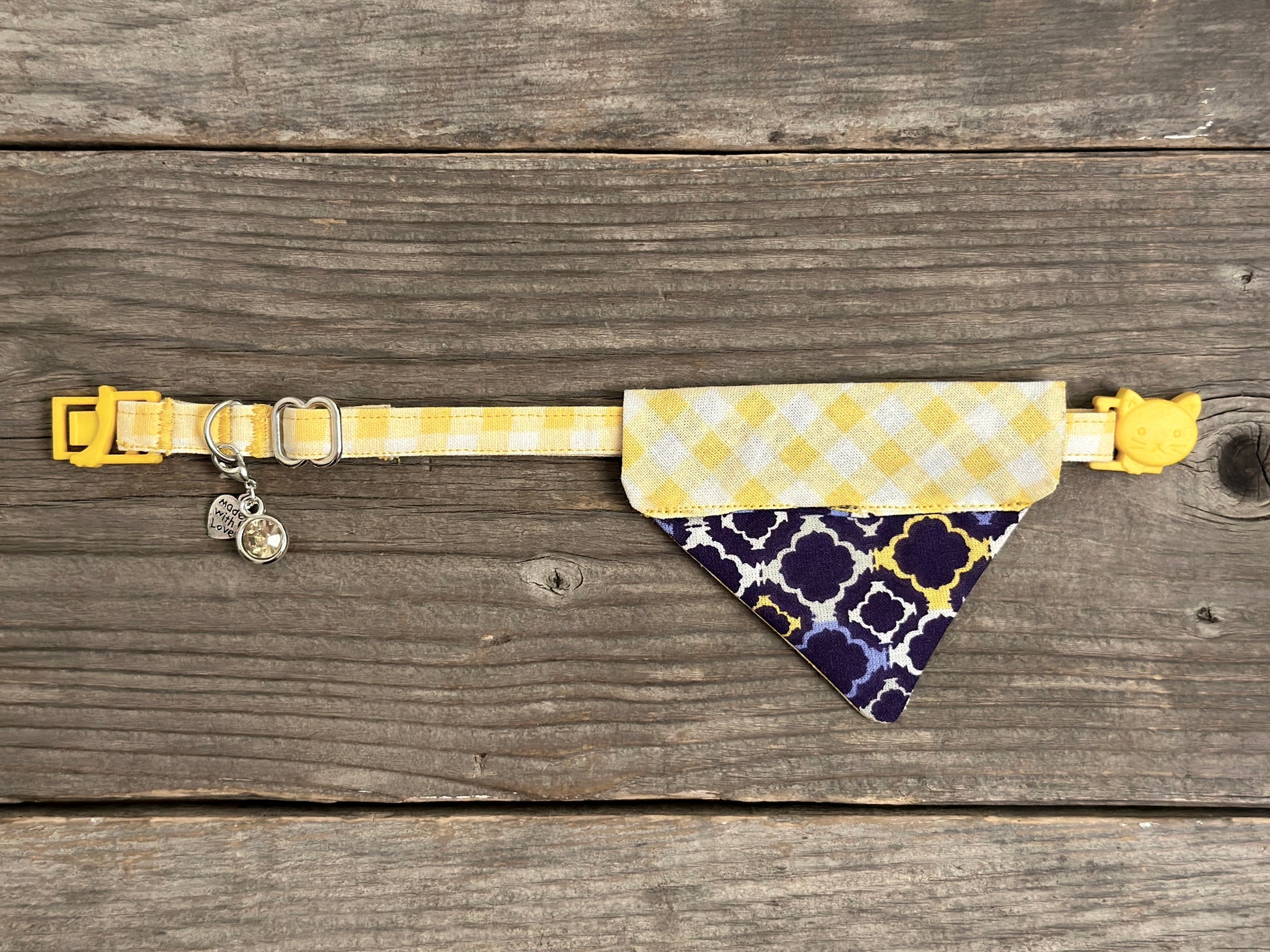 This adorable cat bandanna slides right onto your cat collar. For some extra cuteness, buy the matching cat collars. This bandanna is 'Lemon Drop' and 'Arabian Nights.' If you'd like a different pairing, just leave us a message in the order notes.