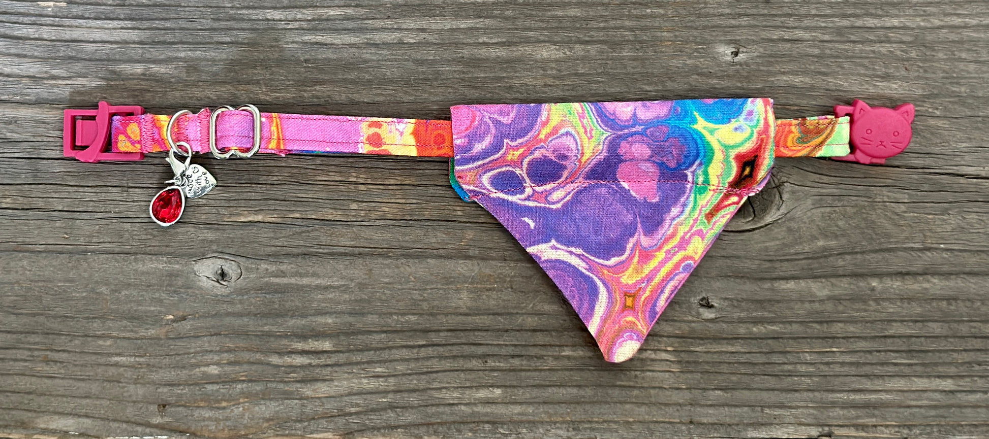 This adorable cat bandanna slides right onto your cat collar. For some extra cuteness, buy one of the matching cat collars. This bandanna is "To Dye For." If you'd like a different pairing, just leave us a message in the order notes.
