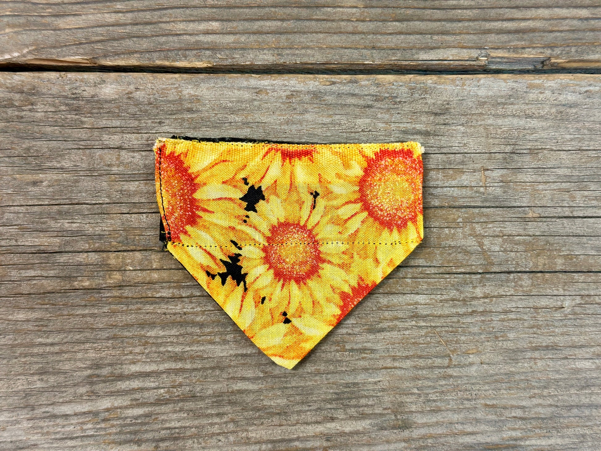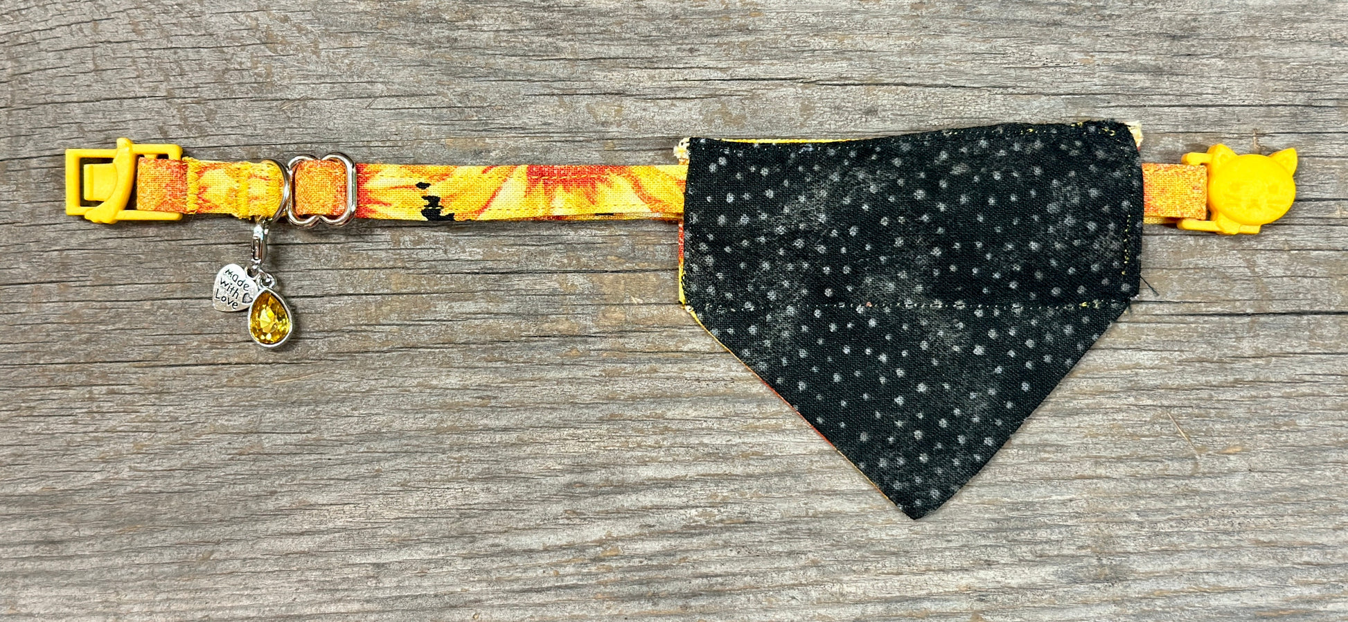 This adorable cat bandanna slides right onto your cat collar. For some extra cuteness, buy the matching cat collars. This bandanna is 'Sunny Days' with coordinating black and grey polka dots. If you'd like a different pairing, just leave us a message in the order notes.