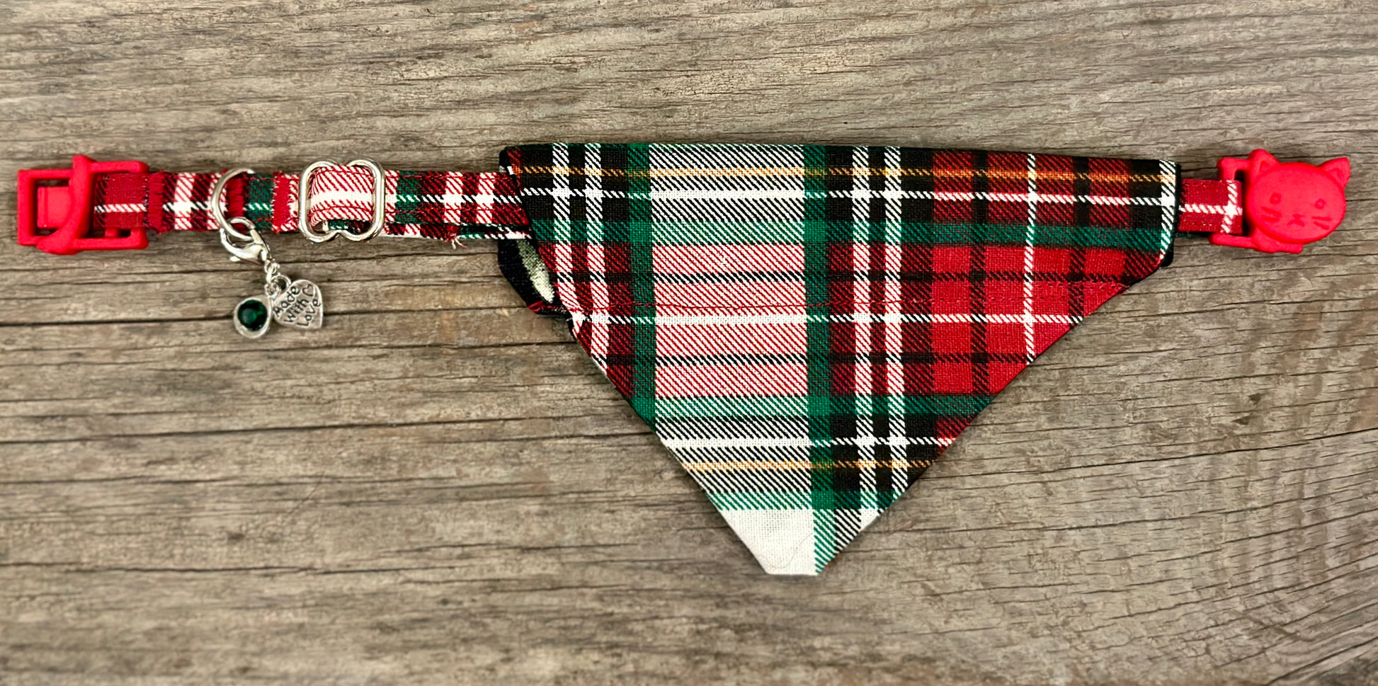 This adorable cat bandanna slides right onto your cat collar. For some extra cuteness, buy one of the matching cat collars. This bandanna is "Winter Garden" and "Plaid for Days". If you'd like a different pairing, just leave us a message in the order notes.