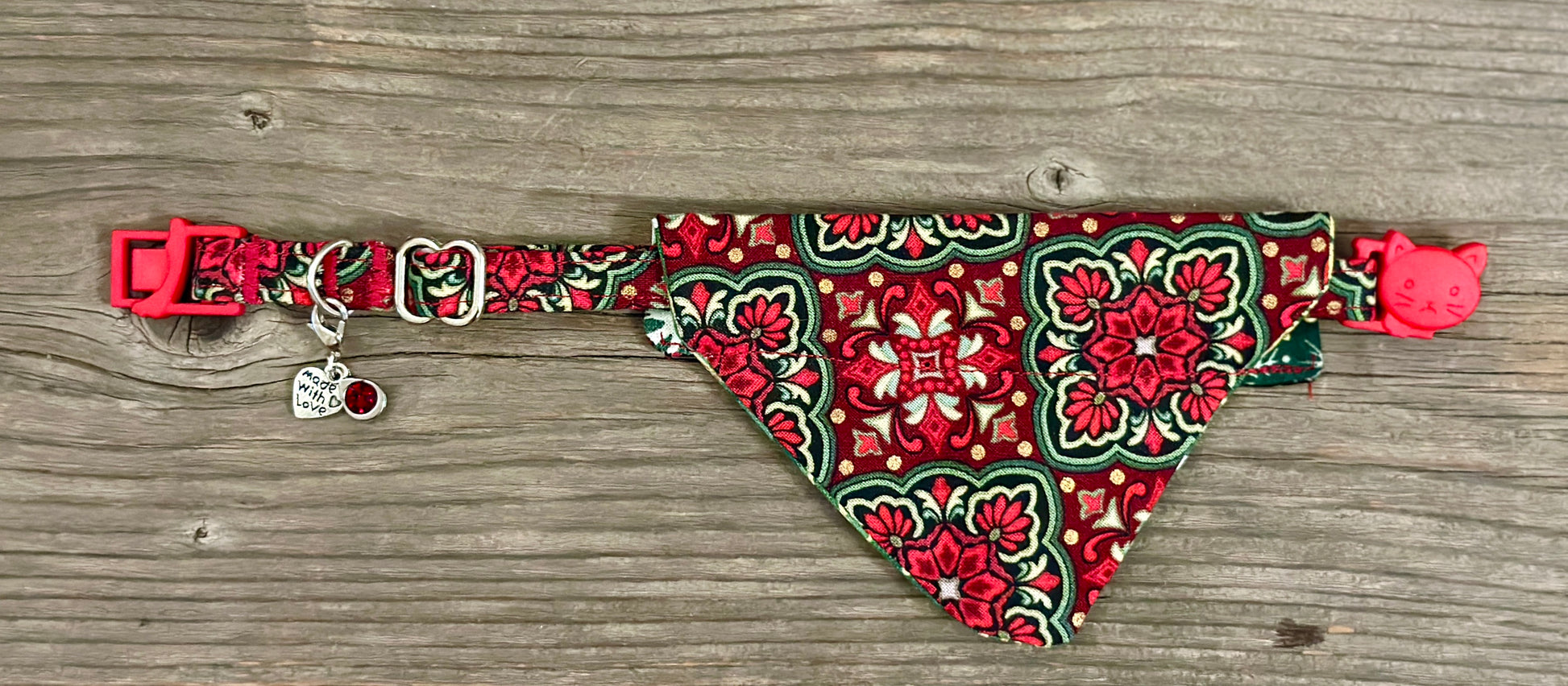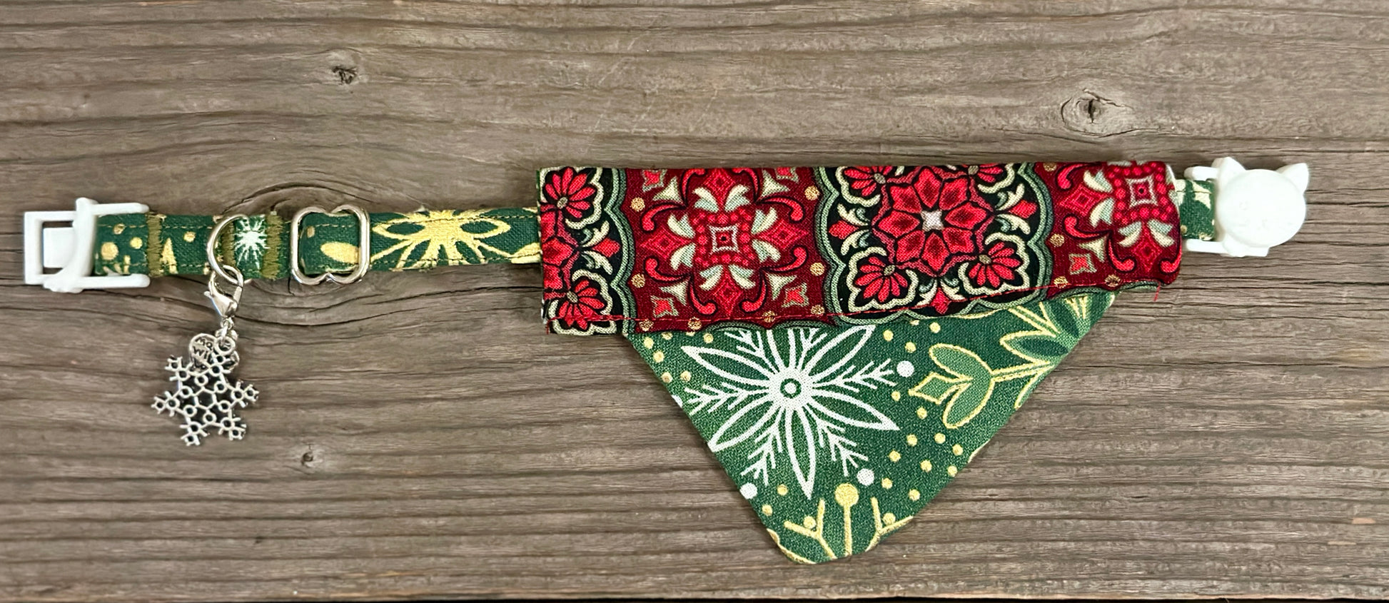 This adorable cat bandanna slides right onto your cat collar. For some extra cuteness, buy one of the matching cat collars. This bandanna is "Winter Sweater" and "'Tis the Season". If you'd like a different pairing, just leave us a message in the order notes.