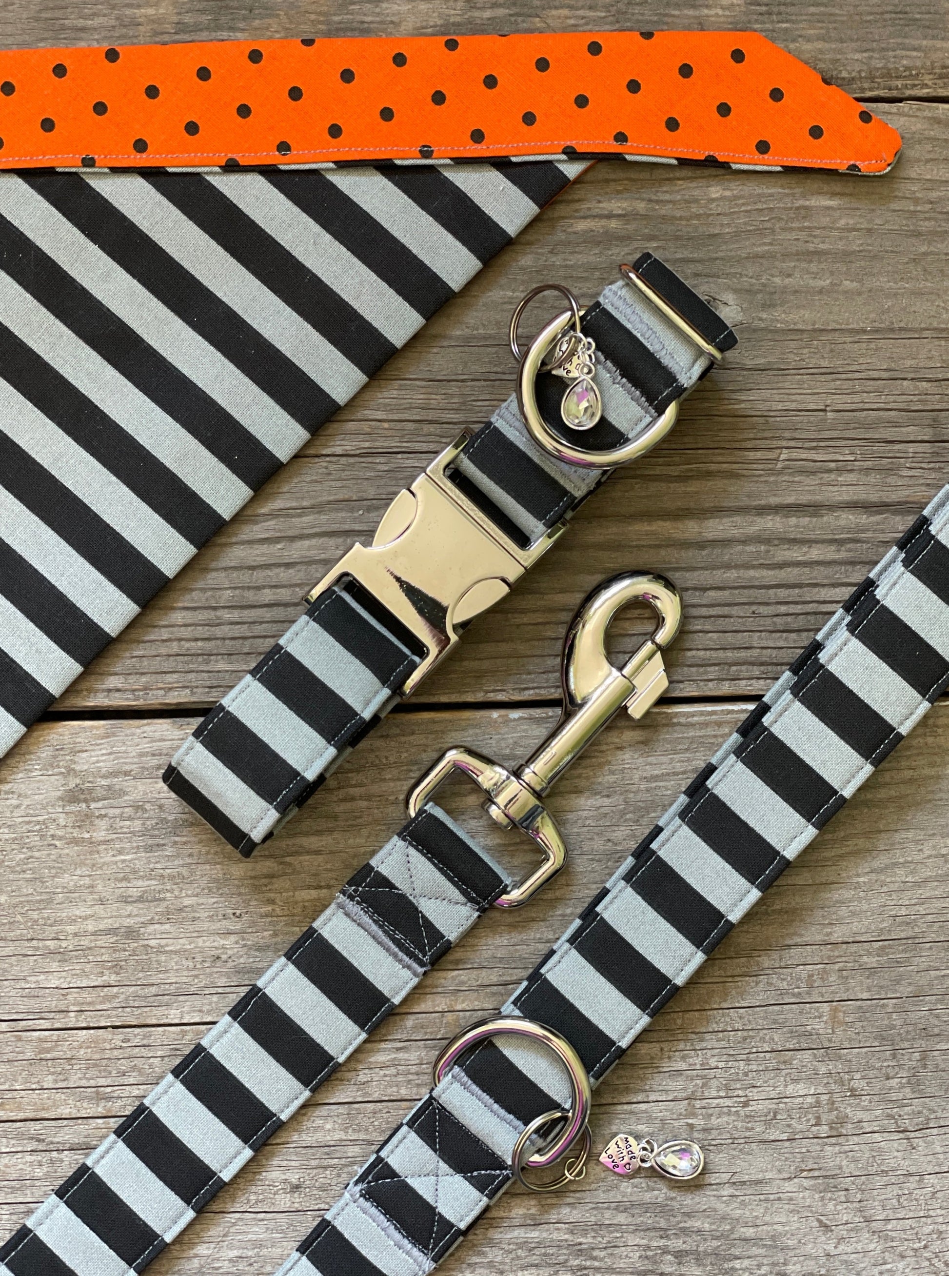 Every fashionable pup needs a matching bandana! This adorable bandana is double-sided! For some extra cuteness, buy one of the matching dog collars. This bandanna is "Let the Ghoul Times Roll" and "Arr me Matey!". The tie strip of the bandana is 30" long. If you'd like a different pairing, just leave us a message in the order notes.