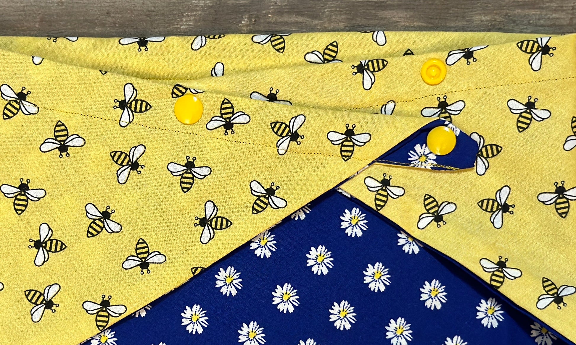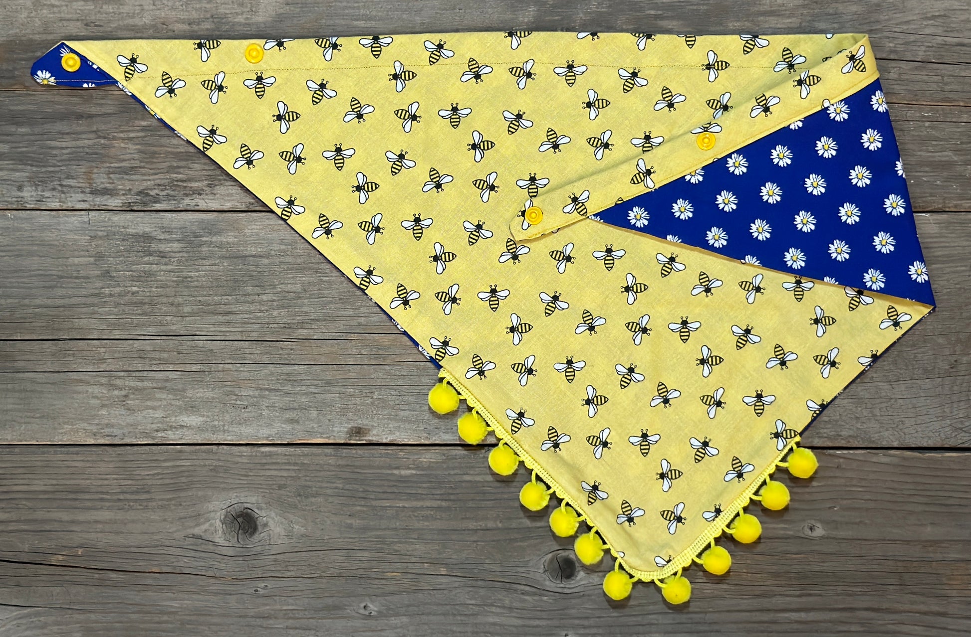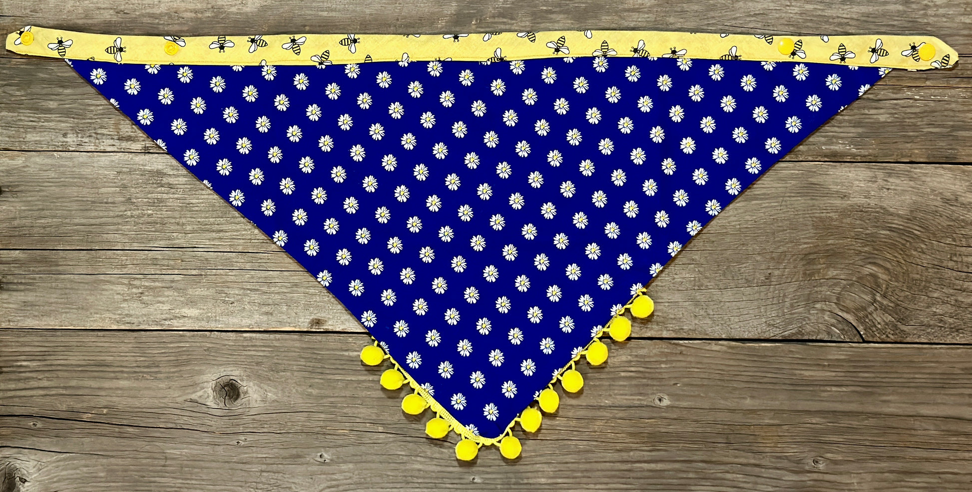 Every fashionable pup needs a matching bandana! This adorable bandana is double-sided! For some extra cuteness, buy one of the matching dog collars. This bandanna is "Buzz Worthy" and "Lauren." The tie strip of the bandana is 30" long and has snaps for adjustability. If you'd like a different pairing, just leave us a message in the order notes.