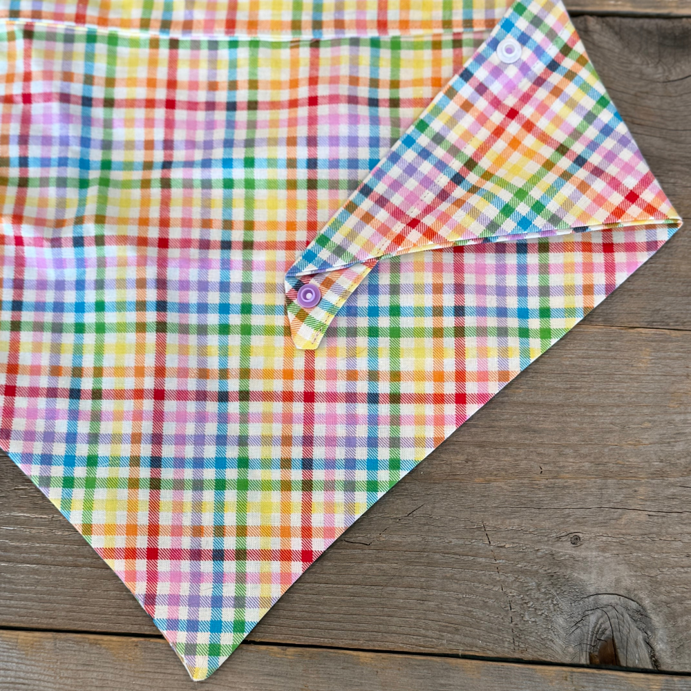 Every fashionable pup needs a matching bandana! This adorable bandana is double-sided! For some extra cuteness, buy one of the matching dog collars. This bandanna is "Candyland" on both sides. The tie strip of the bandana is 30" long and has snaps for adjustability. If you'd like a different pairing, just leave us a message in the order notes.