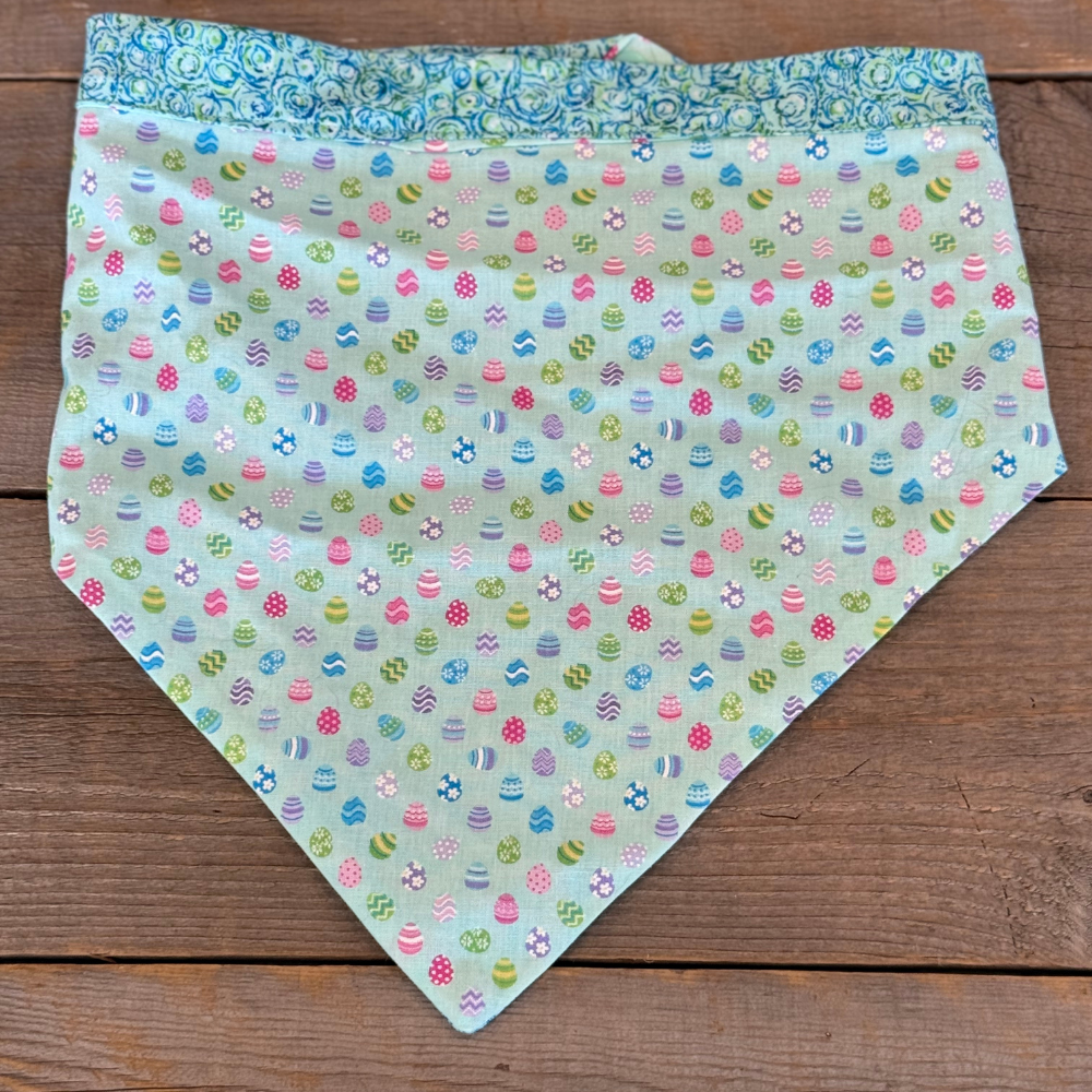 Every fashionable pup needs a matching bandana! This adorable bandana is double-sided! For some extra cuteness, buy one of the matching dog collars. This bandanna is "Eggstravagant" & "Island Lagoon" The tie strip of the bandana is 30" long and has snaps for adjustability. If you'd like a different pairing, just leave us a message in the order notes.
