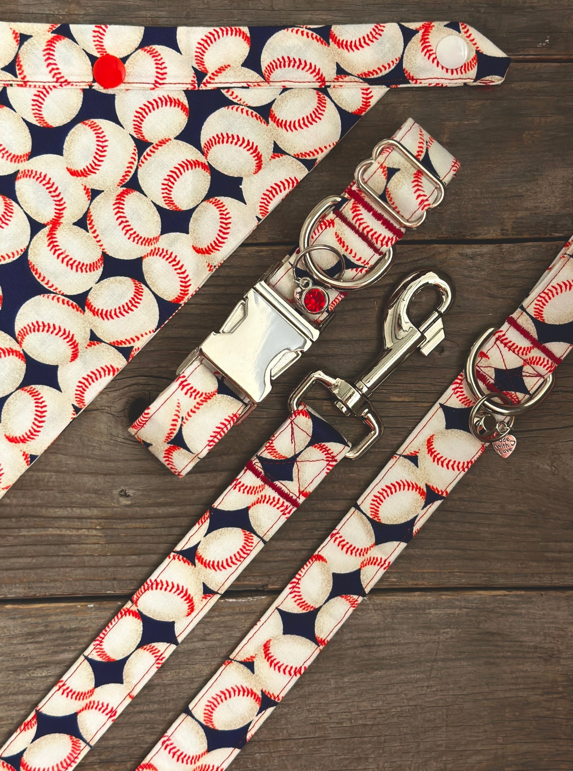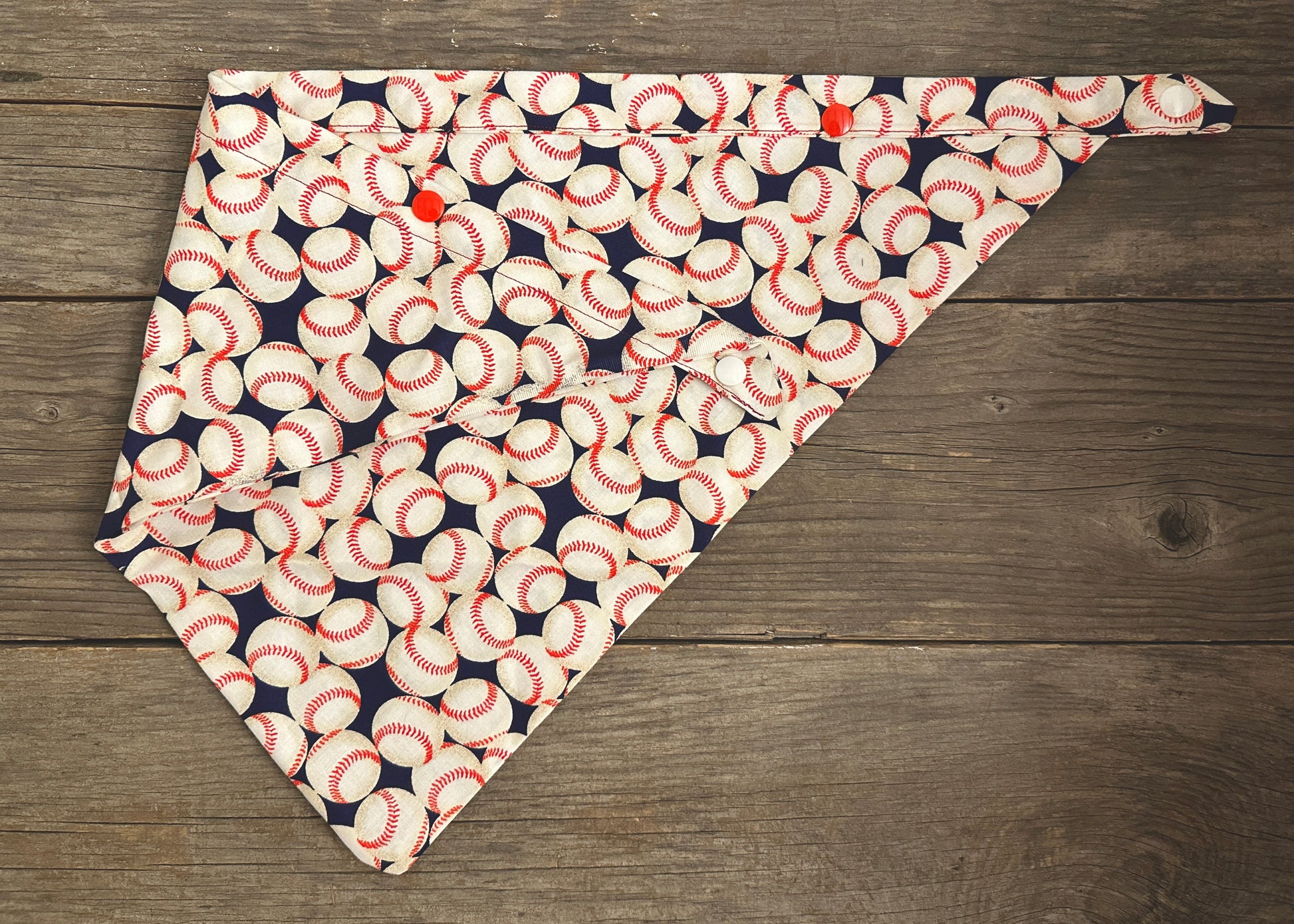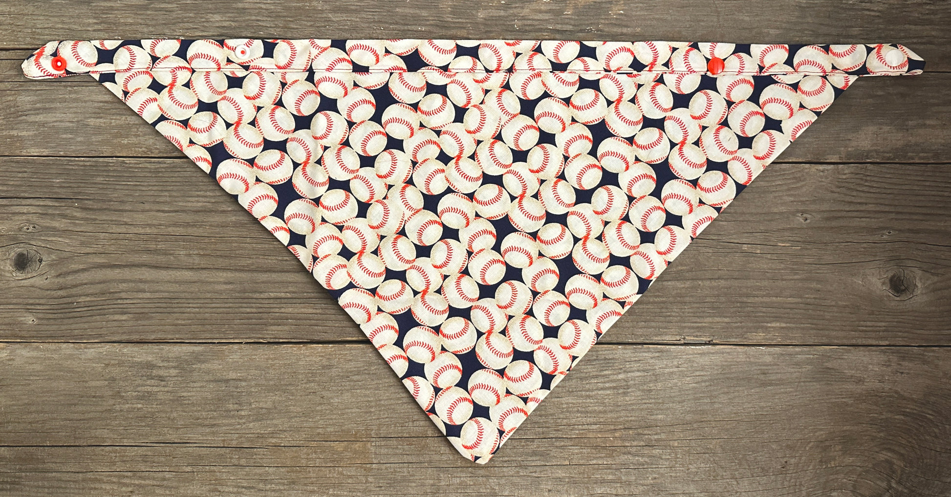 Every fashionable pup needs a matching bandanna! This adorable bandana is double-sided! For some extra cuteness, buy the matching dog collar. This bandanna is 'Hey, Batter Batter!' The tie strip of the bandana is 30" long and has snaps for adjustability. If you'd like a different pairing, just leave us a message in the order notes.