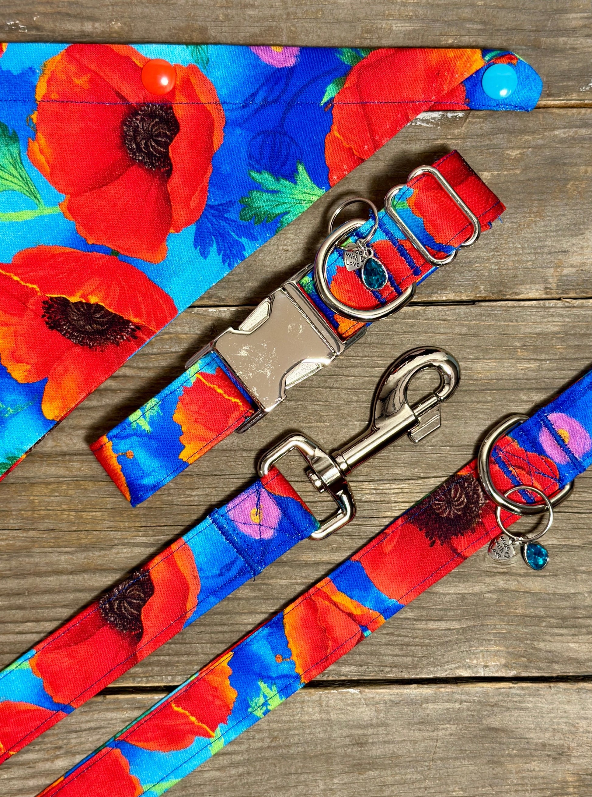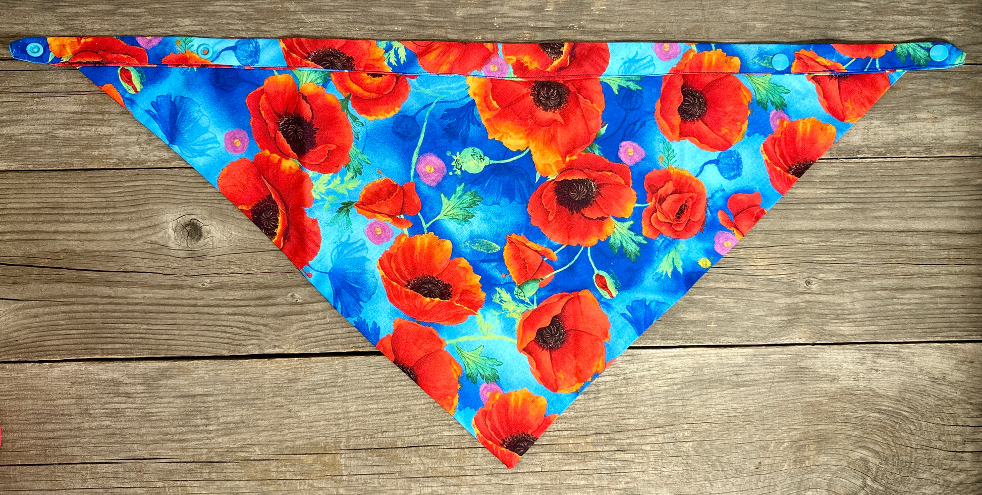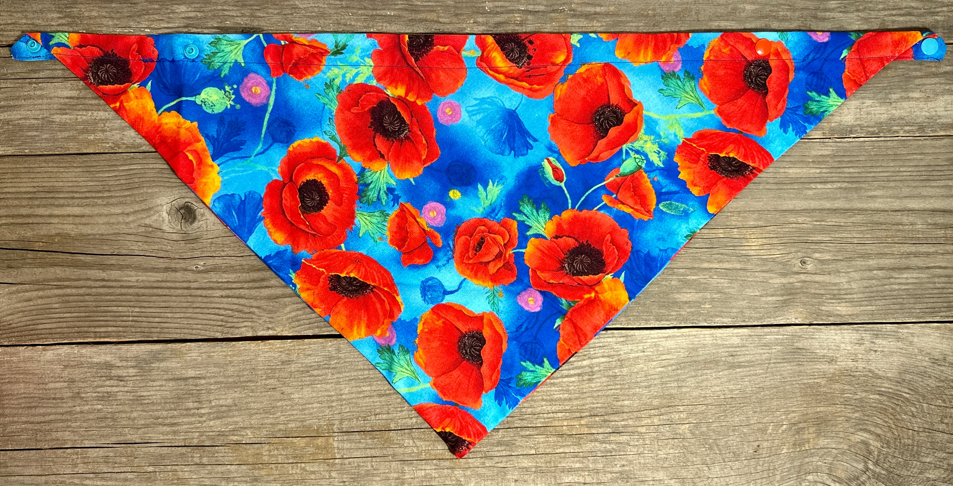 Every fashionable pup needs a matching bandanna! This adorable bandana is double-sided! For some extra cuteness, buy the matching dog collar. This bandanna is 'Midsummer Night Garden.' The tie strip of the bandana is 30" long and has snaps for adjustability. If you'd like a different pairing, just leave us a message in the order notes.