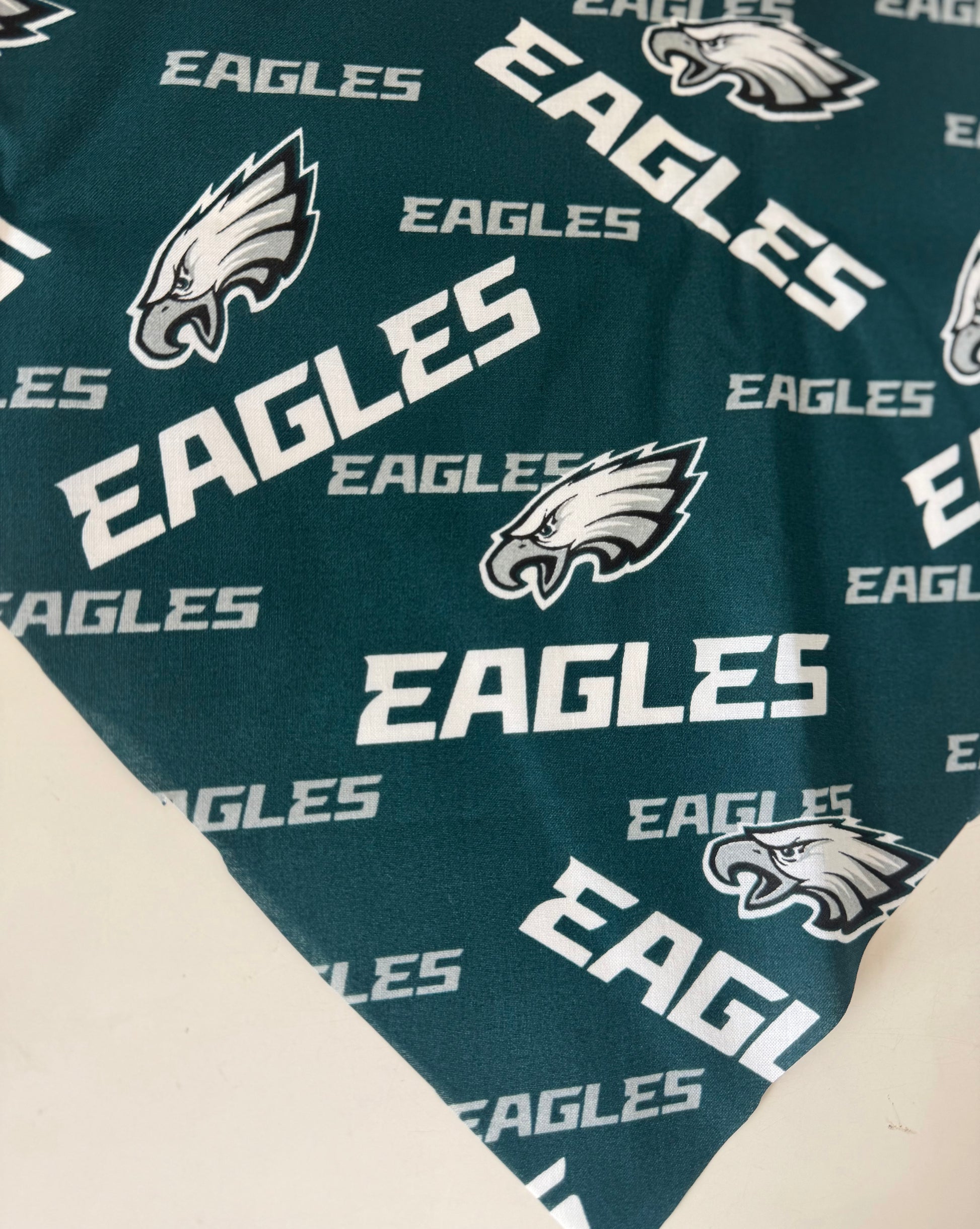 Every sports fan needs a bandana! This jaunty bandana is double-sided! For some extra sportiness, buy one of the matching dog collars. This bandanna has a white eagles logos fabric on one side and footballs with a cute chalkboard background on the other side.