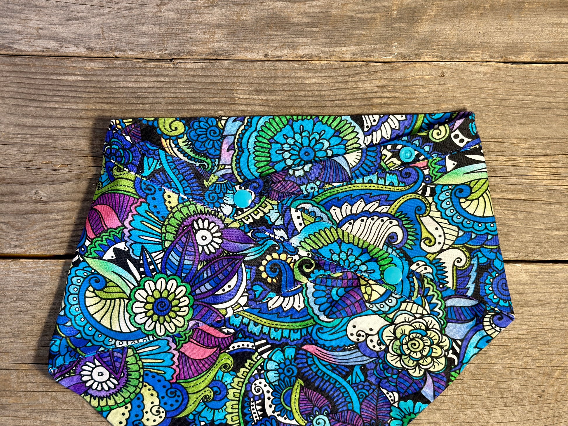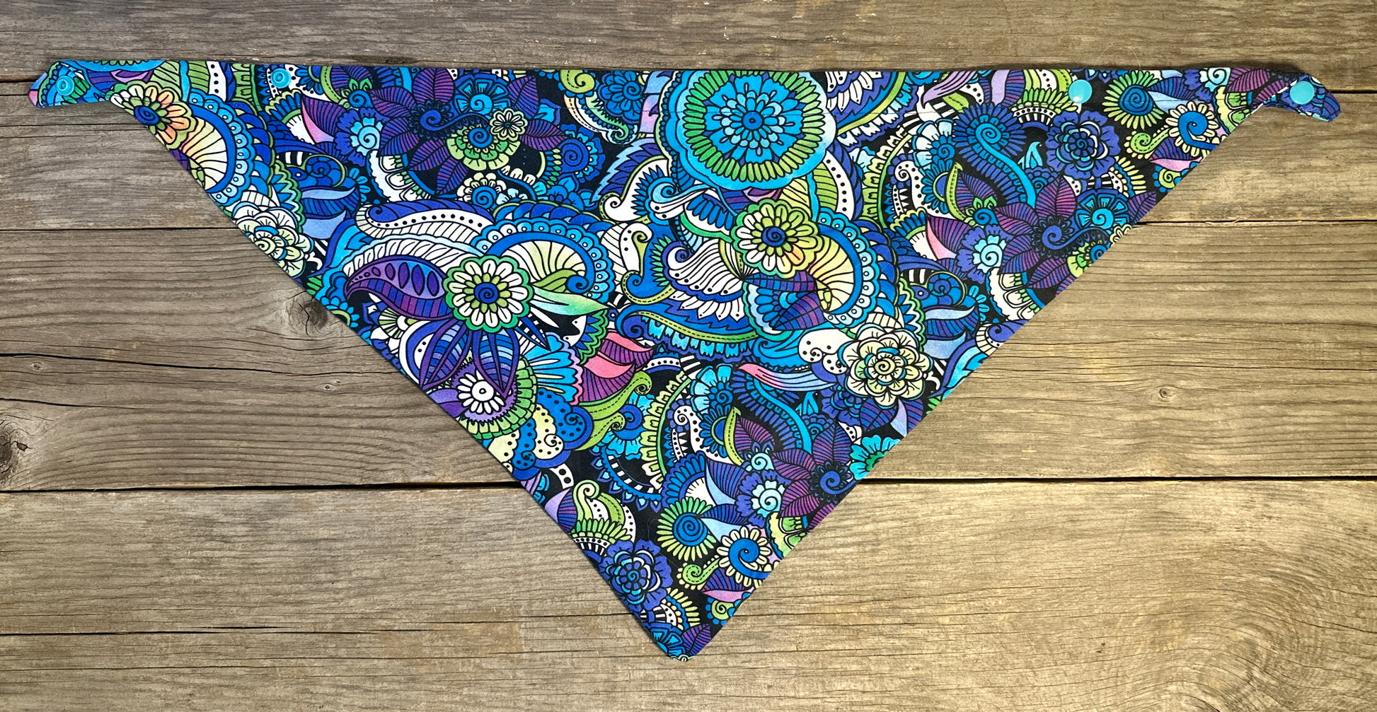 Every fashionable pup needs a matching bandanna! This adorable bandana is double-sided! For some extra cuteness, buy the matching dog collar. This bandanna is '(Zen)tangled in color.' The tie strip of the bandana is 30" long and has snaps for adjustability. If you'd like a different pairing, just leave us a message in the order notes.