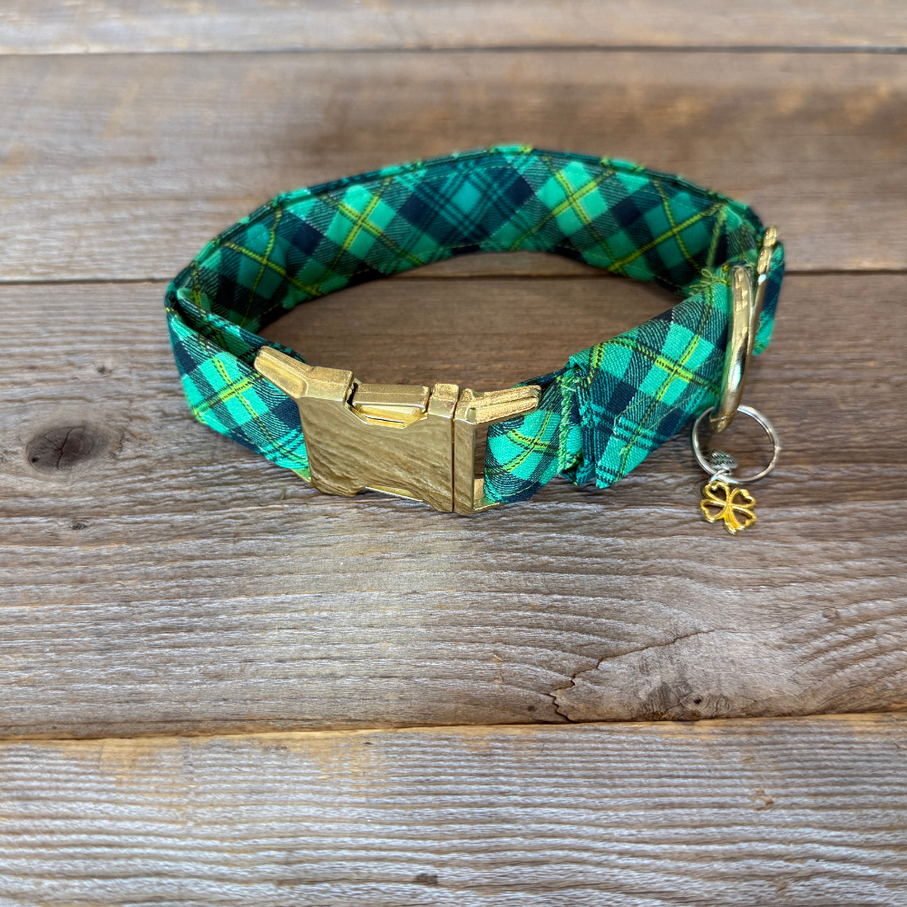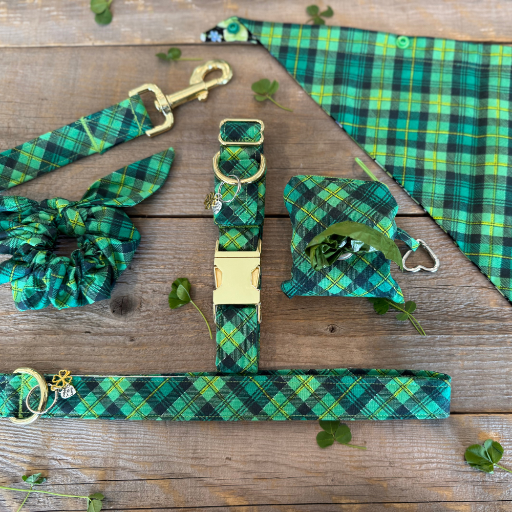 Wrap your pup in the timeless charm of the Emerald Isle Plaid collar, a dapper nod to rolling green hills, misty mornings, and cozy Celtic traditions! Woven with deep emerald, rich forest green, and golden threads of luck, this plaid masterpiece evokes the warmth of a countryside hearth and the spirit of grand adventures through ancient castles and whispering glens. Whether your furry friend is a noble guardian of the land or a playful rogue with a heart of gold, the Emerald Isle Plaid collar ensures they step out in style—fit for an Irish legend in the making!