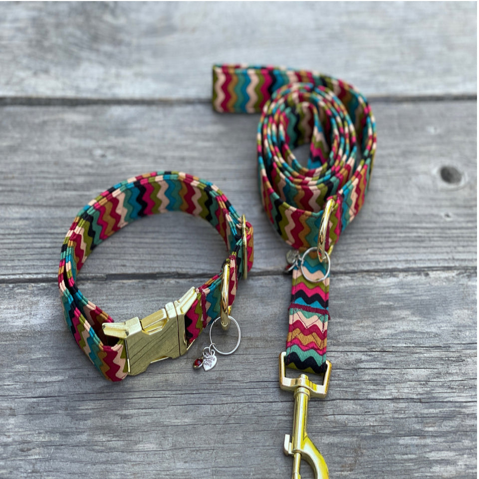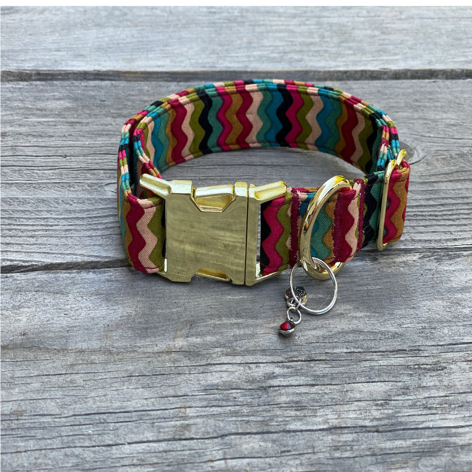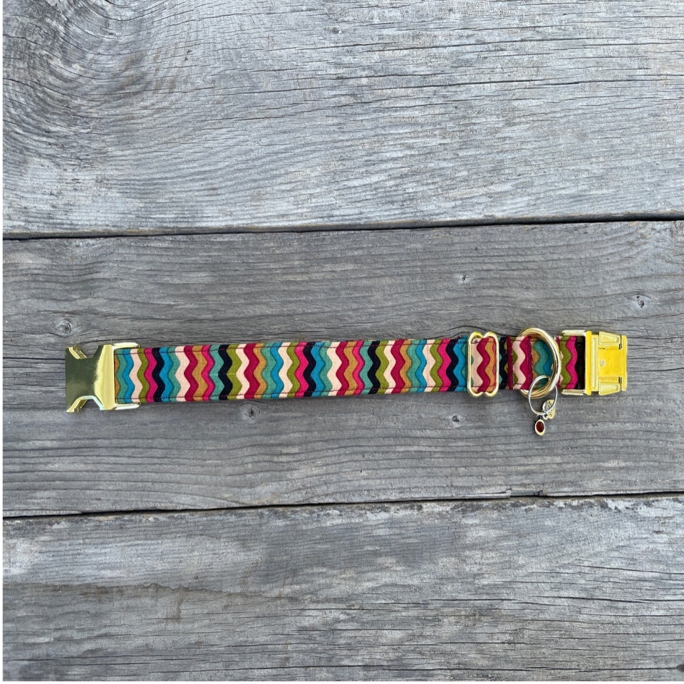 This colorful Chevron print is a great way to bring Fall into action! The rich autumn browns, blues, creams and reds are a great way to welcome fall and look perfect on any color fur. This is a wonderful collar for any Fall party or holiday. Your pup will be the star of the season in this beautiful print!