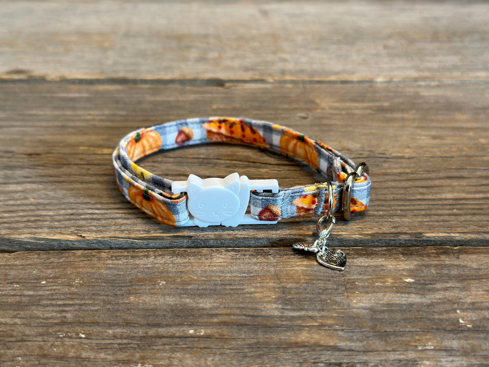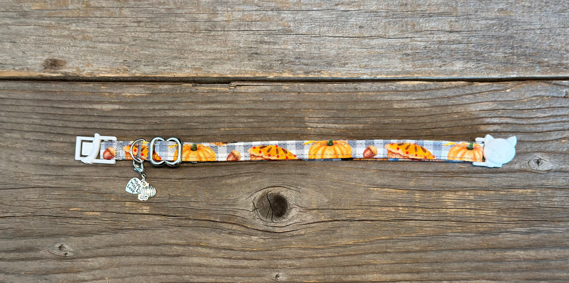 Our cat collars are 3/8" wide and have a plastic breakaway buckle.