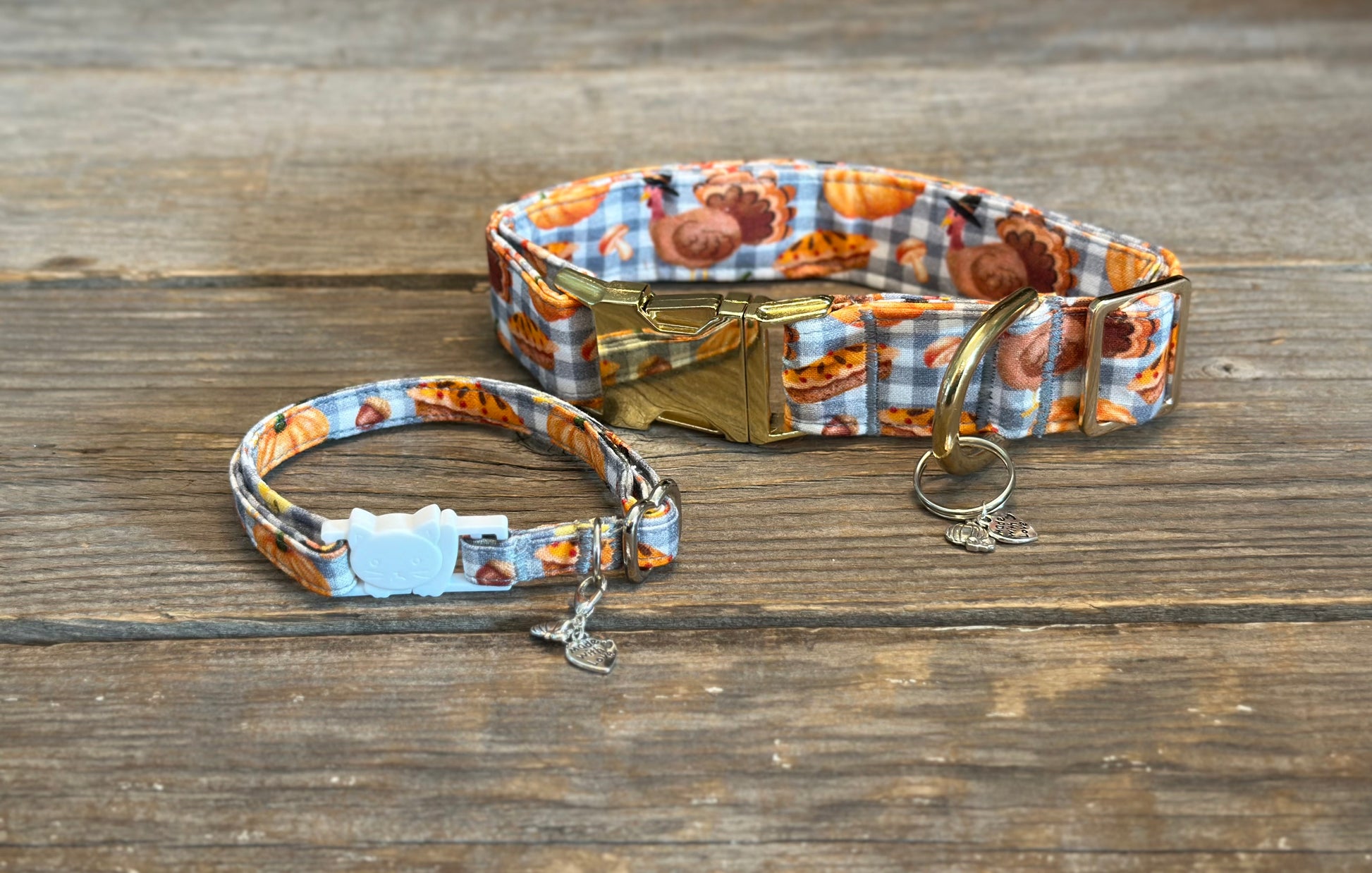 This charming design is set on a cozy grey gingham backdrop sprinkled with all the Thanksgiving necessities: pumpkins, pies, cranberries, mushrooms, acorns, pilgrim hats, and apples. Amongst all the food are turkeys scattered about dressed in their dapper hats! Perfect for those who love to celebrate the season in style, this pattern is a cozy nod to all the flavors and festivities of fall. So, get ready to pop your pants top button, relax, and enjoy the Thanksgiving feast.