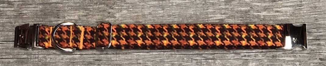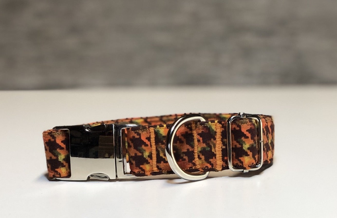 This collar brings back the nostalgia of sitting on grandma’s couch while waiting for Thanksgiving dinner and homemade pumpkin pie. This collar is perfect for a dressed up feast, but casual enough for a nap on the couch. This collar gives off vintage vibes with its orange, brown, and auburn houndstooth pattern. Each collar comes with a coordinating charm*. This hand-crafted collar is made with 100% cotton fabric and your choice of a metal or plastic buckle with a matching adjuster. Each collar is made with a reinforced metal D-ring. This elegant collar is sure to last for years.