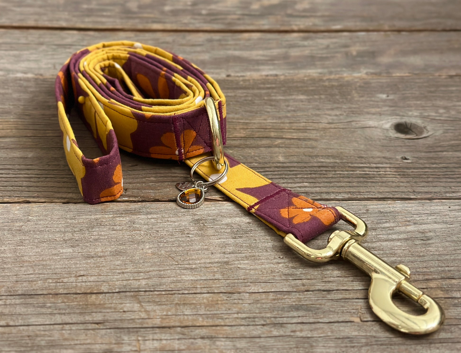 Our handmade leashes feature a heavy-duty metal spring-loaded hook that attaches to the D-ring on your pet's collar. Every leash is 1 inch wide and five feet long and has a D-ring at the handle to attach keys, poop bags, or anything else you need.