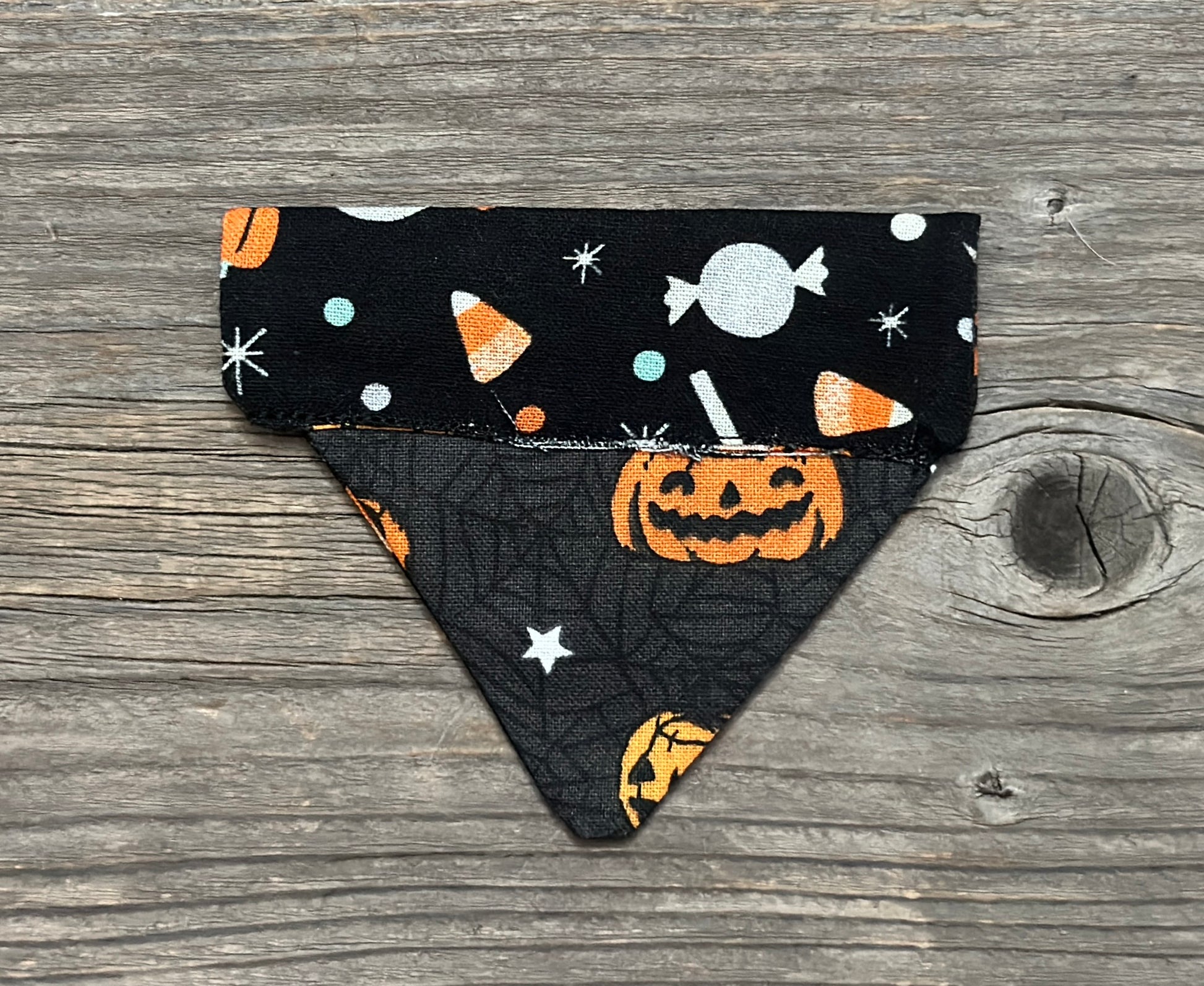 Celebrate your Halloween haul in ghoulish delight with this classic pattern. All your favorite childhood trick-or-treating candies are poured onto this darkly fun design. A collection of blue, white, and orange lollipops, candies, and polka dots are mixed with candy corn, bats, pumpkins, and abstract stars that will leave you feeling spooktacular.