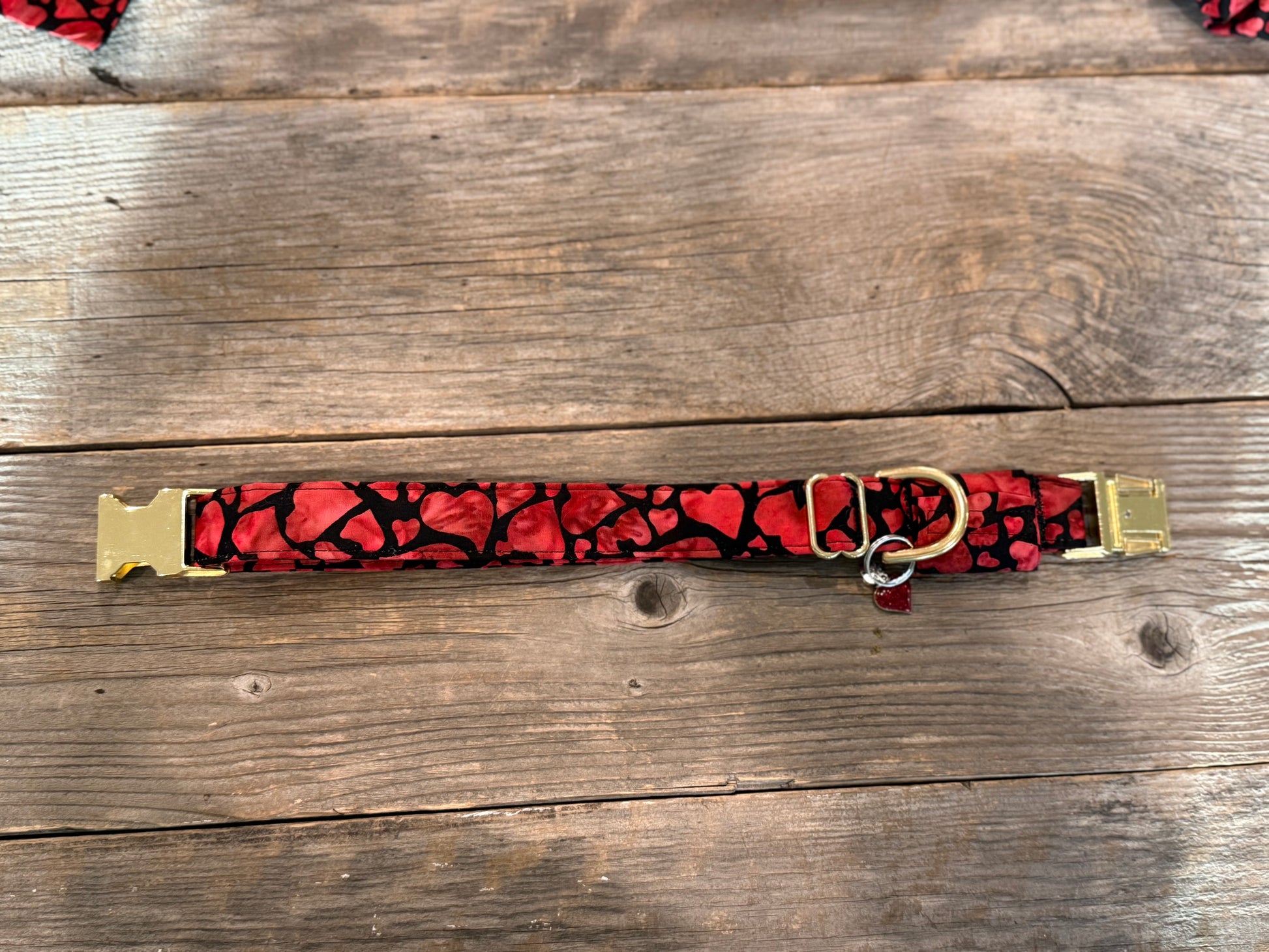 Add a touch of love to your pets wardrobe with our Heartthrob collar! This fabric is, adorned with vibrant red hearts on a bold black background, is perfect for showcasing your pets style. Whether for Valentine’s Day or just to show your love, this collar will make your furry companion the center of attention.